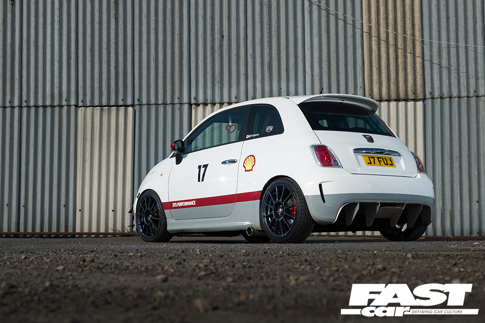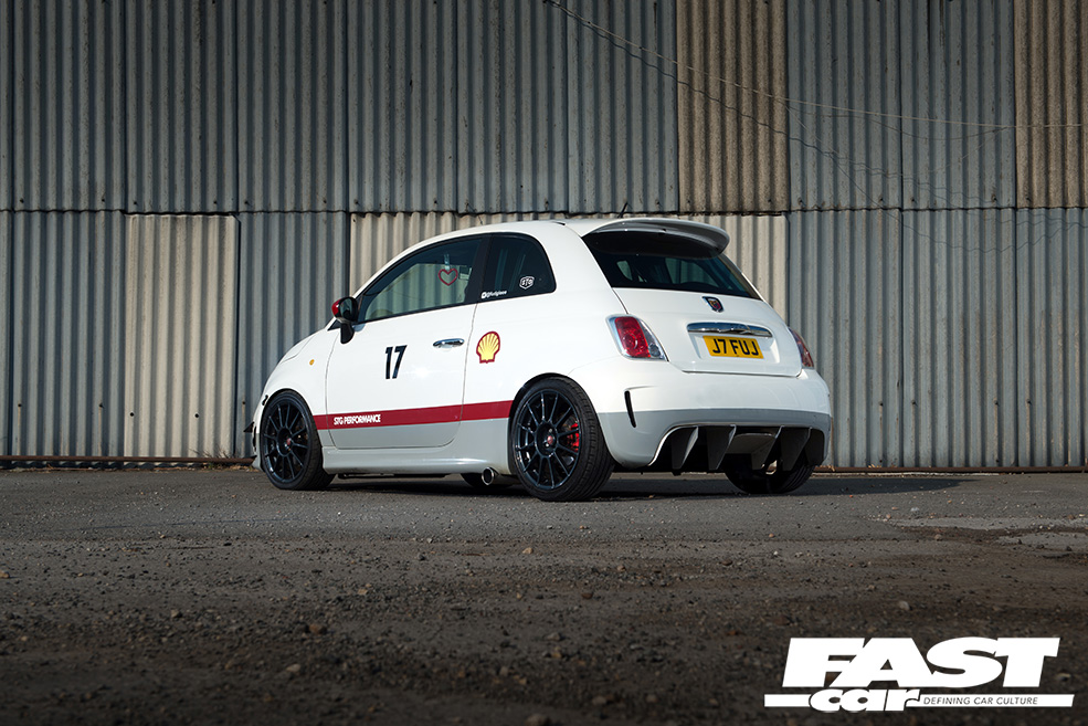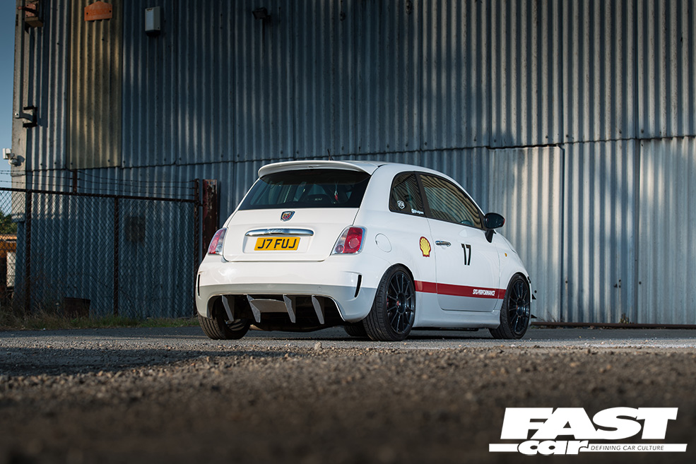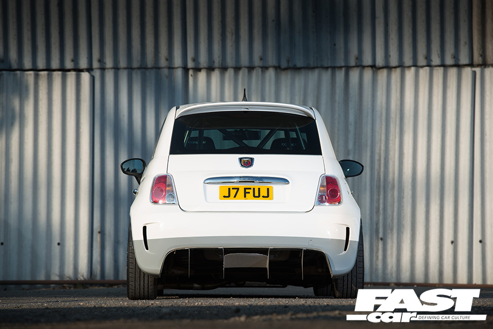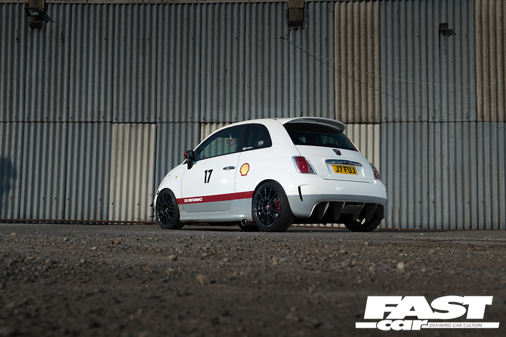 Abarth Assetto Corse livery (wrapped by Paintkillers), custom aluminium rear diffuser by STG Performance, canards, bonnet vent, yellow light tints, stubby aerial, quick-release bumper fasteners.