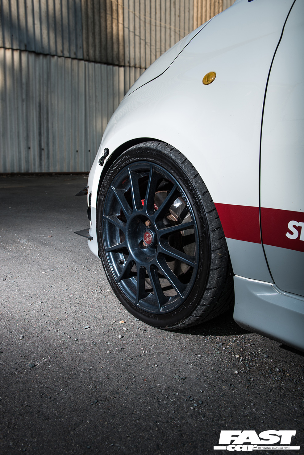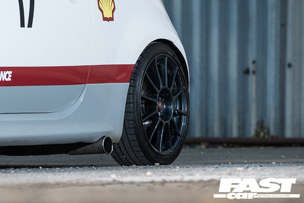 7×17-inch Abarth EsseEsse wheels, 16mm rear spacers, JOM coilovers, DNA Racing Components lightweight lower arms, OMP racing front upper and lower strut braces.