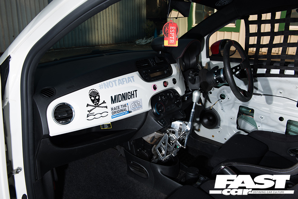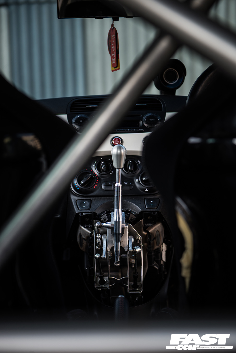 “Then Shane at STG told me he’d like to try and make a race-style rear diffuser as he’d never made one before,” he continues, “so I gave him the keys and let him work his magic! After that I finished the interior off with a set of Corbeau Clubsports which I found on eBay getting sold locally for an absolute steal.” This all adds up to a full-on race car vibe; the outside makes its own statement with the nouveau-retro livery mixing with snorting pipes and Abarth EsseEsse rims (along with those yellow lights, we just love yellow lights), and the interior must make for a hilarious experience when pottering to the shops – that CAE shifter, the buckets and harnesses, the cage, the window nets, plus the fact that it’s all stripped out… it’s more Hangar Straight than High Street, and it totally reframes the 500’s inherent cheekiness.