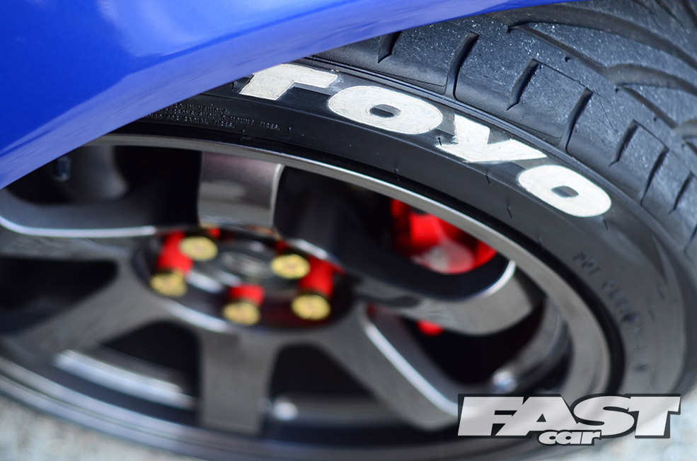 9x17in ET30 Rota Grid Drift alloy wheels with shotgun shells as lug nut covers; 225/45×17 Toyo Proxes T1-R tyres; VOGTLAND adjustable coilovers; OEM Alfa Romeo Brembo brakes all-round.