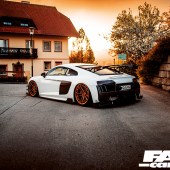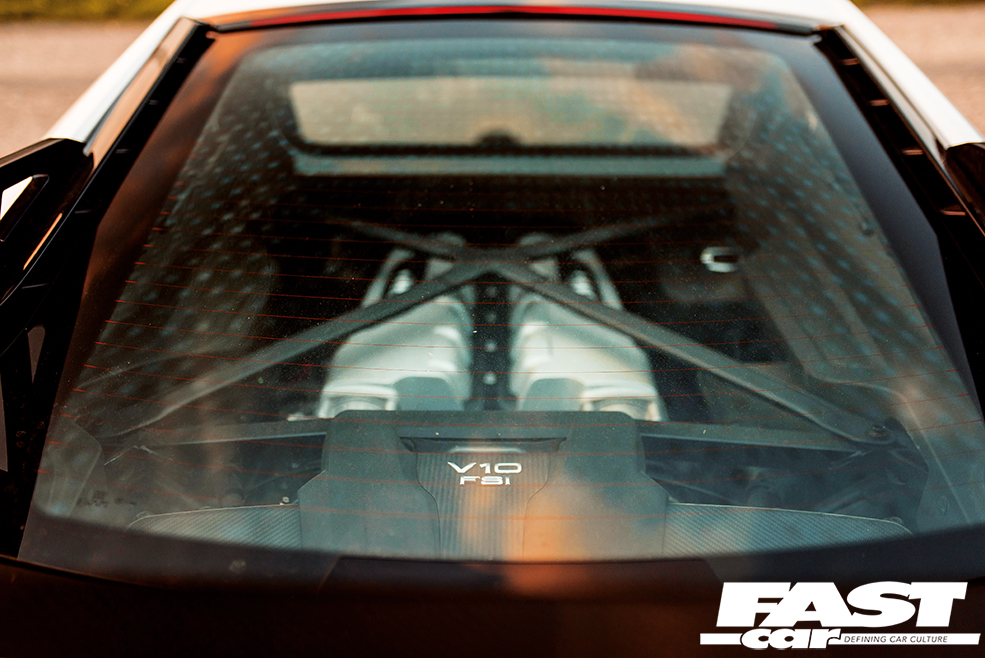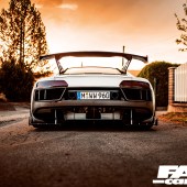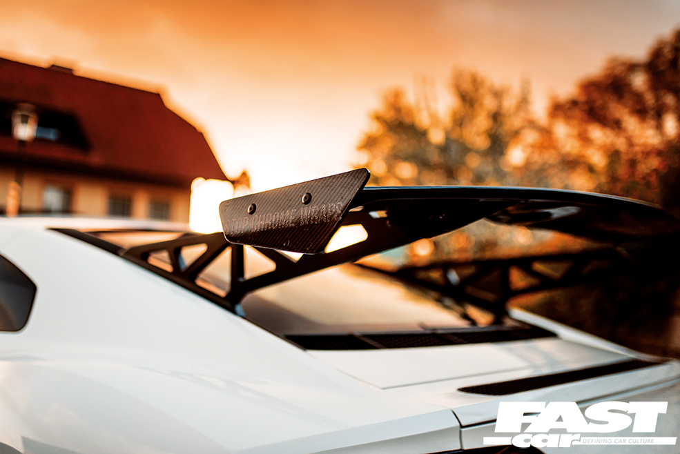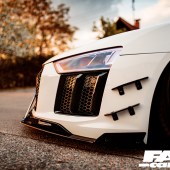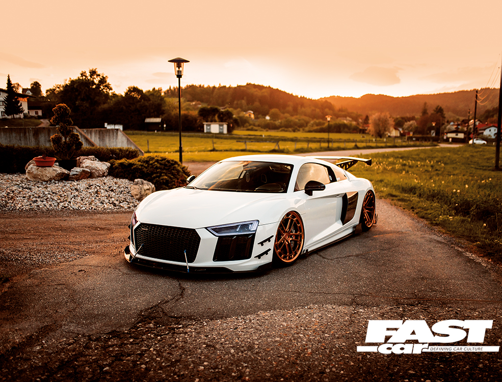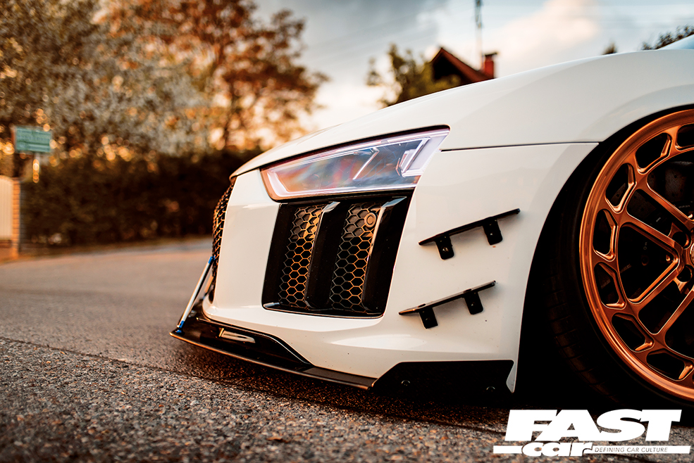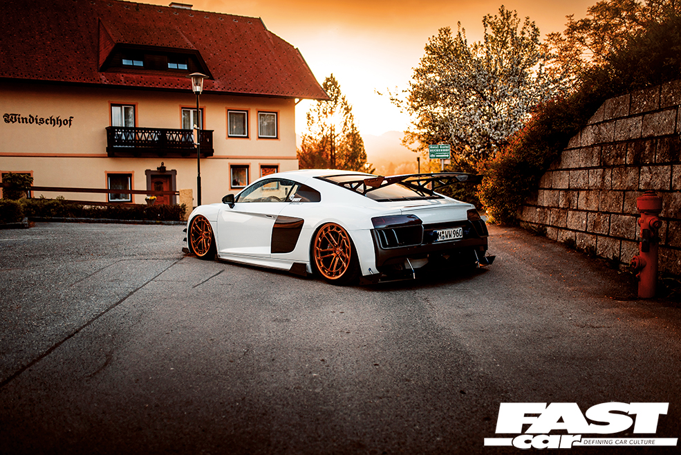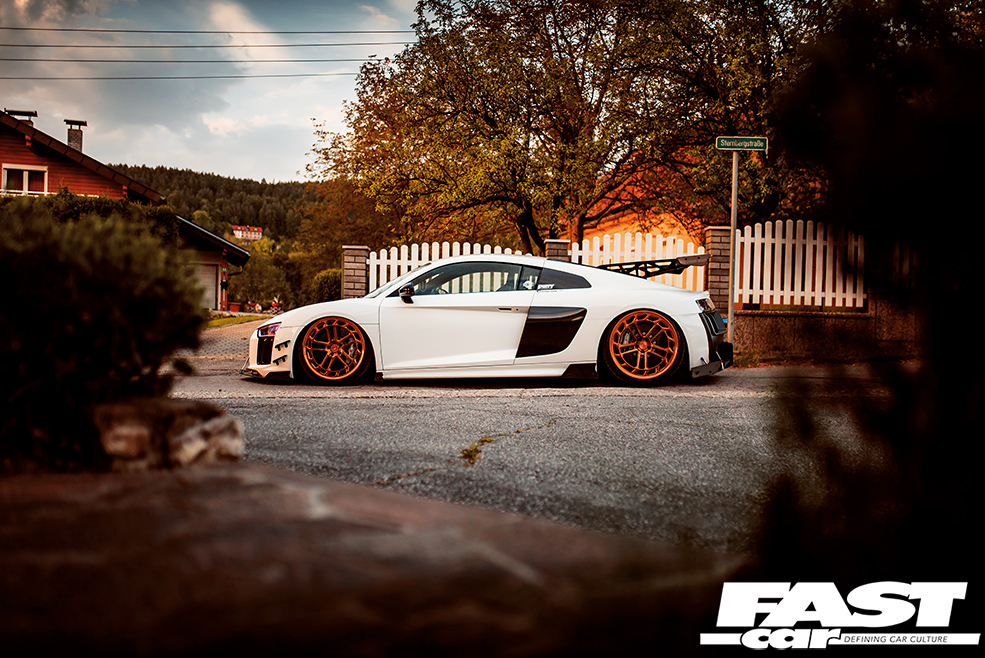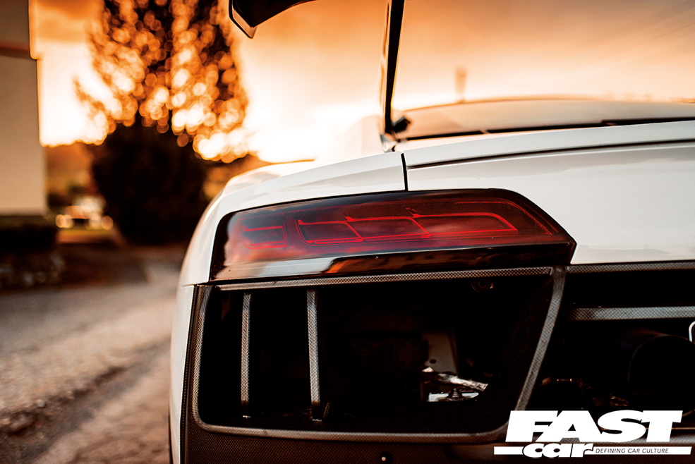 Seeing that he was going to be splashing out on an exotic, our man Otto decided he should forgo the base model and go for the “Plus” R8, because having a shade under 540 horsepower would simply never do, especially when over 600 ponies can be had with a factory warranty attached, they dress it up in carbon too. “I managed to find a basically new 2015 with less than 1300 miles on it,” explained Otto, “It was in Ibis White which was a real plus for me,” he joked, “for me it’s the best colour they come in, it really shows off the amazing lines of the car.” Leaving the car stock had never been part of the plan, so within a couple of weeks of signing on the dotted line the coupe was dropped off across the border to Austrian tuners Puffy Performance. “I’ve worked quite a bit with the guys on my previous cars and they always know what to do and how to do it. We had my old RS6 tuned to just over 750hp with the handling and wild exhaust note to match,” he told us, “I knew they could do even more with the R8 so calling them first was natural.” Although our man was fairly tight-lipped about the specifics of the work carried out under the engine cover, he assured us that the lads at the shop borrowed very heavily from the Lambo Huracan Performante playbook, apparently there’s been “considerable” software shenanigans. “They also built a custom straight piped exhaust which is insanely loud, it sounds exactly the same as an F1 car at wide open throttle.” Visually the plan for the car had been hatched even before he’d bought one, perhaps the most outlandish and aggressive looking version of the car Otto had seen was the infamous factory backed GT3 LMS. “The whole idea behind modifying the car was to blend the supercar scene with the tuning scene, I wanted the car to have a real hard edged race car style with extreme power and the looks to match.”
