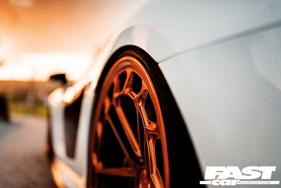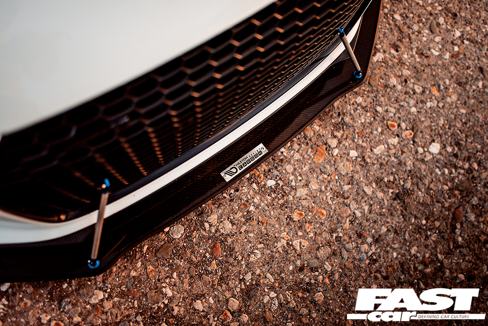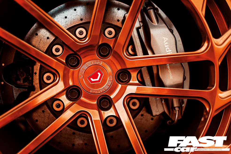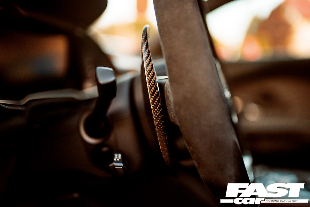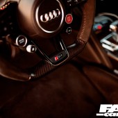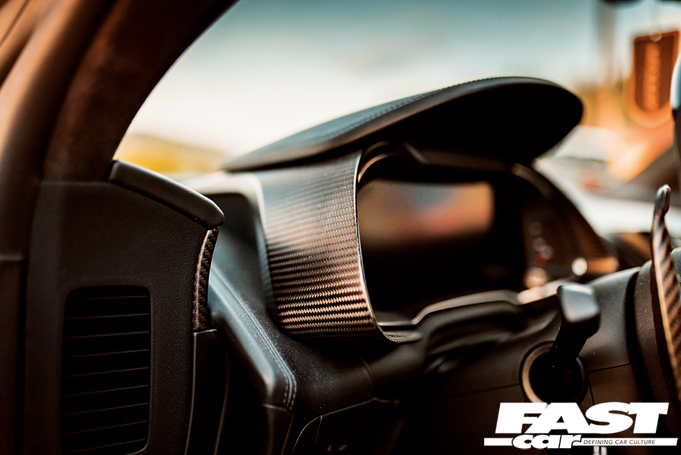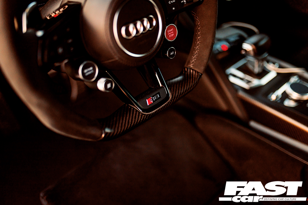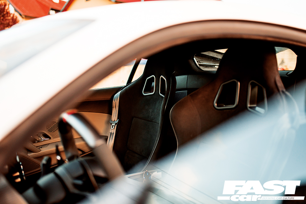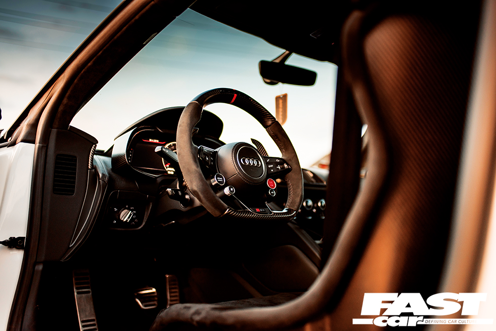 UK based Maxton Design supplied most of the additions to the bodywork, the rear wing and sideskirts received a little custom reforming before being blended to the aluminium. “Certainly the most difficult part of the project was the front bumper. It’s a factory GT3 item and tracking one down took a lot of work, aside from that, being a works racecar part it was never designed to bolt onto a street car.” By all accounts a good deal of custom work went into attaching the prized part, although Otto tells us it was well worth the effort. A heavy tint on the OEM LEDs and a deep splitter up front, along with a custom rear diffuser, adds to the track car flare. The factory fresh R8 cabin conjures up visions of twisty chicanes and chequered flags without much help, but Otto reckons throwing in a Neidfaktor steering wheel and R8 GT full carbon bucket seats adds to the motorsport mix.