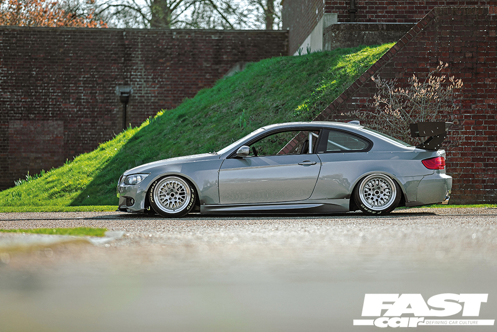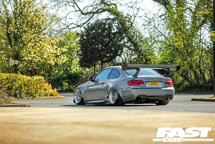 He’s not kidding. In fact, Lee’s 335d E92 project has passed through five distinct phases thus far, and it’s not showing any signs of slowing down (in every sense of the term) any time soon. The first iteration saw him fulfilling that initial wish list with a set of BC coilovers, new wheels and a map, but it quickly levelled-up to version two. This entailed fitting a full air-ride setup along with a set of shiny new Rotiforms, window tints, a ducktail spoiler and a custom exhaust system. Version three saw Lee swapping back to coilovers, stripping out the tints, adding CCW wheels and a front splitter, and playing with the turbo-diesel motor a bit – hybrid turbos, EGR delete and swirl flap delete, upgraded fuel pump and intercooler. The fourth evolution ushered in that outrageous wide-arch kit, a pre-production item from Fitment Lab, for which the wheels were built wider. The car was swapped to a manual gearbox with the exterior wrapped in cream, and the interior enjoyed a comprehensive makeover with a roll-cage and rear seat delete, Recaro Pole Positions and a Coolerworx shifter. Meth injection also entered the fray at this point. And finally, we arrive at the car you see here, version five: we’re talking Air Lift Performance 3P suspension, M3 carbon leather trim, an exterior swap back to the original colour, a Wavetrac LSD, a host of chassis upgrades, and that unmissable Big Country Labs GT wing.