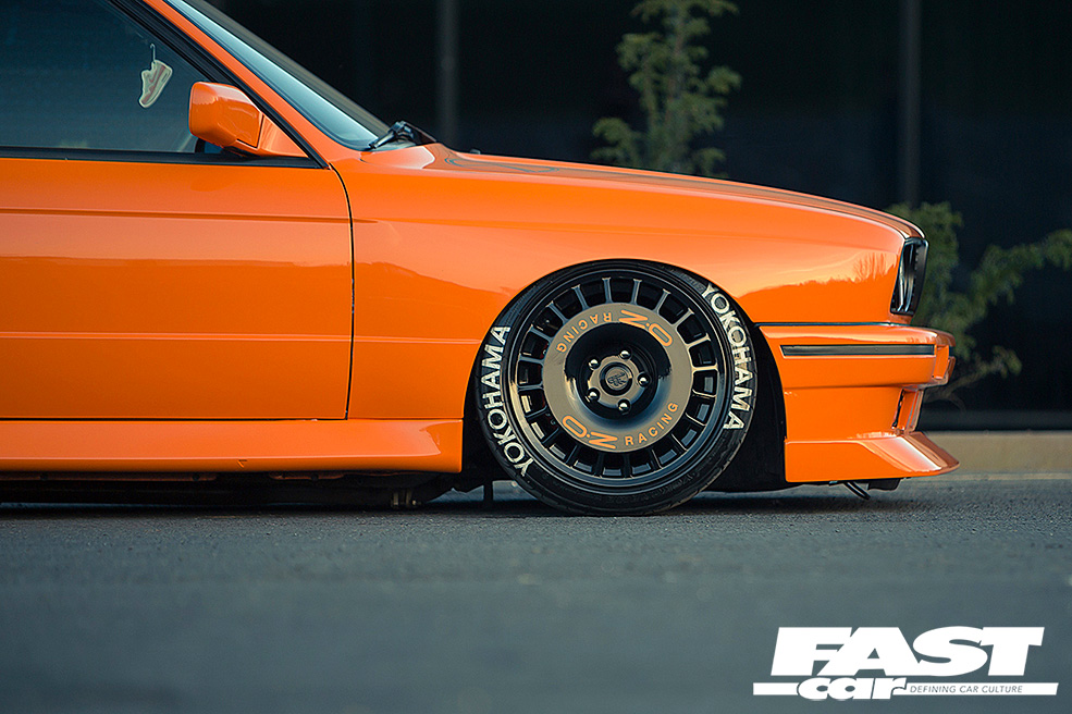 When it came to sorting out the old paint Nick went balls out with a full respray in Inka orange. No build would be complete without a set of suitable hoops. Just days before its big reveal, Nick’s mate Kos spotted these 8x17in Compomotive TH wheels. They were quickly refurbished and finished off in gloss black before being tucked inside the E30’s rolled arches, tidy.