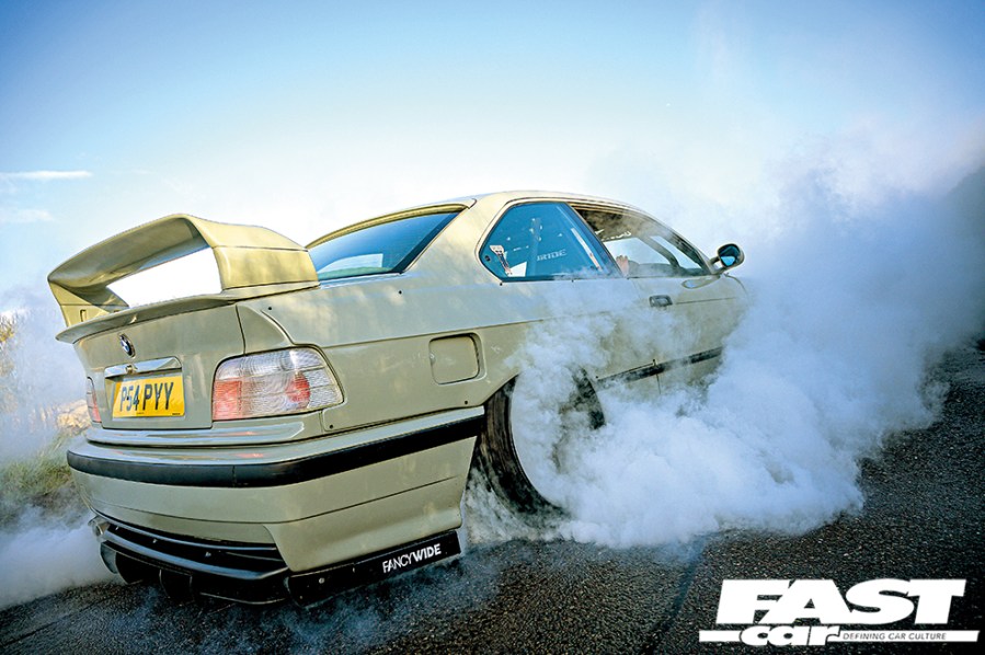 And you can see from the eager burnout shots that he’s keen to use his road-racer with the axis tilted more toward ‘racer’. Anyone who’s owned an M52-engined E36 will know there are a few tried-and-tested methods to get it snarling just a little bit harder, starting with the M50 inlet manifold. Elliot’s kept it simple here, adding an induction kit and a flash tune with a raised rev limiter, while the exhalation is now taken care of by a catless manifold and straight pipes. Tasty ingredients that lead up to a delectable package. “I added a larger radiator and uprated fans too, as M52s like to run hot,” he explains. See, all of this has been built to be practically usable – it may have been the over-arching aim to create a savage look, but this was never meant to be a show pony: there’s no point ticking the aesthetics box if all you’ve created is an ornament. The racer look is cool, but the holistic racer vibe is more important.
