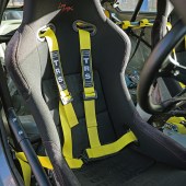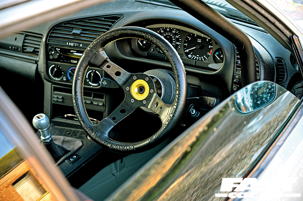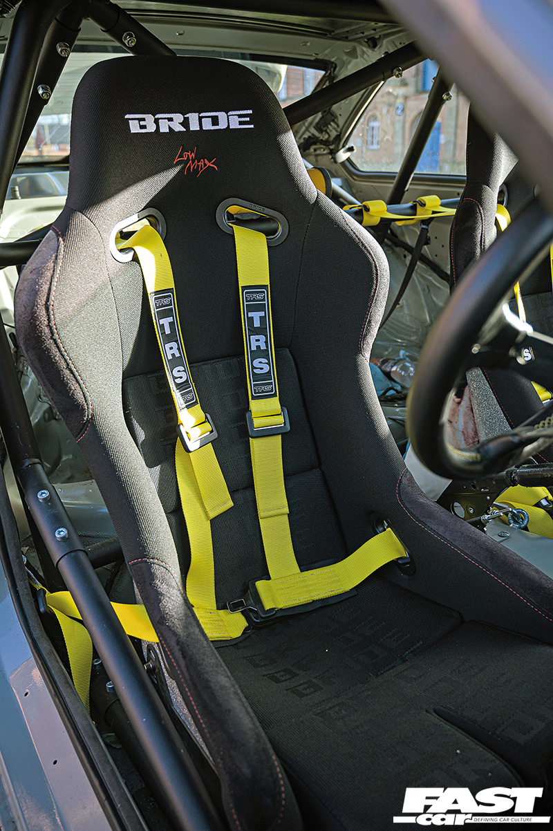 Fully stripped, Bride Low Max seats, custom seat rails, Vertex steering wheel, yellow TRS harnesses, honeycomb carbon fibre door cards, helmet net, custom fire extinguisher, Wink mirror, full custom weld-in roll-cage