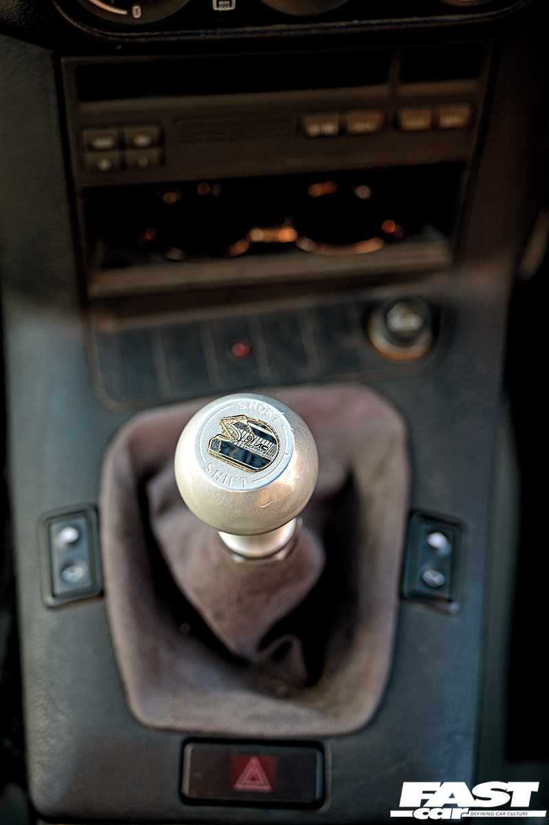 2.8-litre straight-six M52B28, M50 inlet manifold, induction kit, raised rev limiter, flash map, catless exhaust manifold, straight-pipe system, larger radiator and upgraded fans, solid engine mounts. OE ZF five-speed manual gearbox, AC Schnitzer short-shift