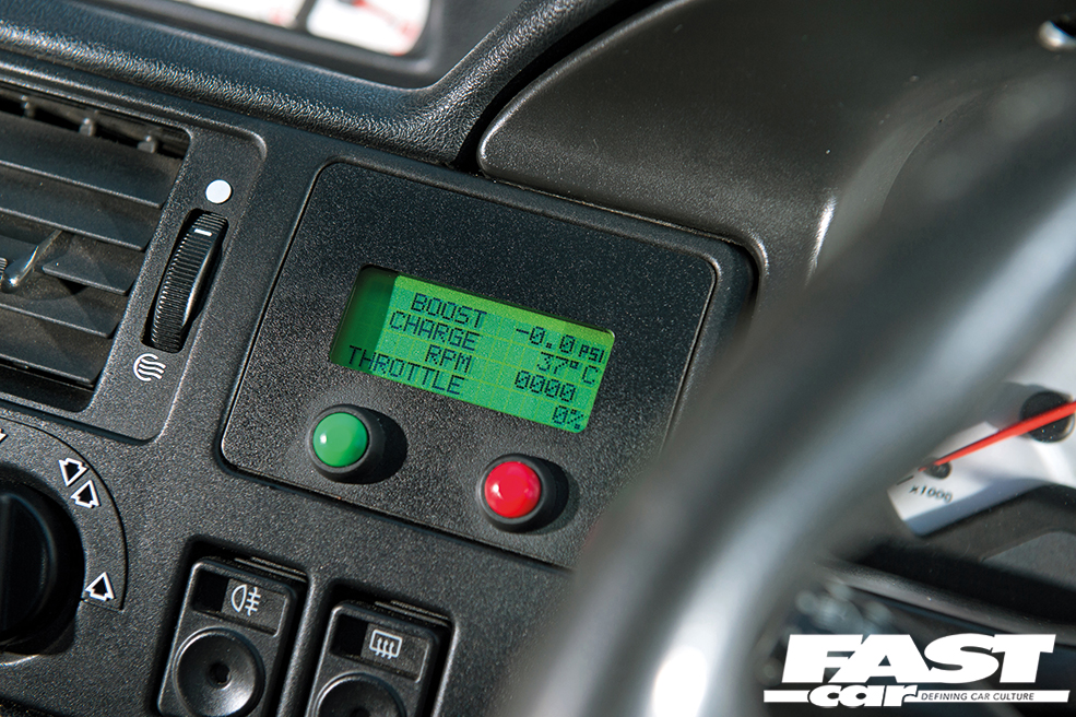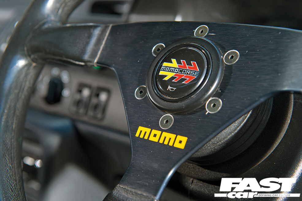 Momo steering wheel, ECU data monitor, Birba Racing dials with 2-bar boost gauge conversion, custom gear lever