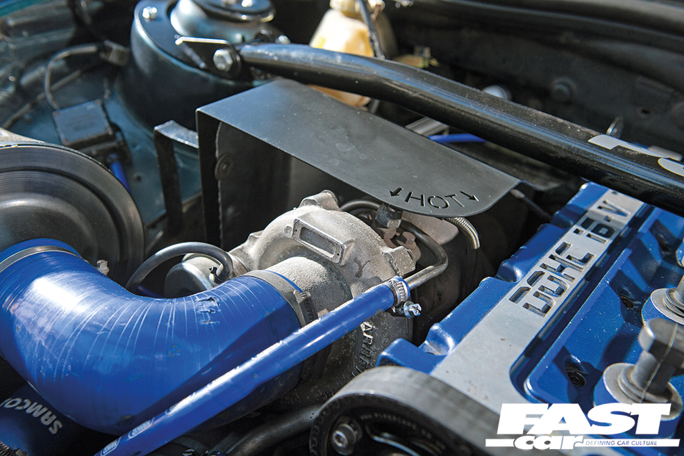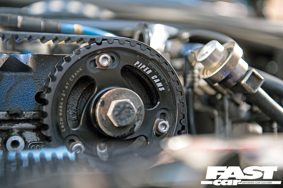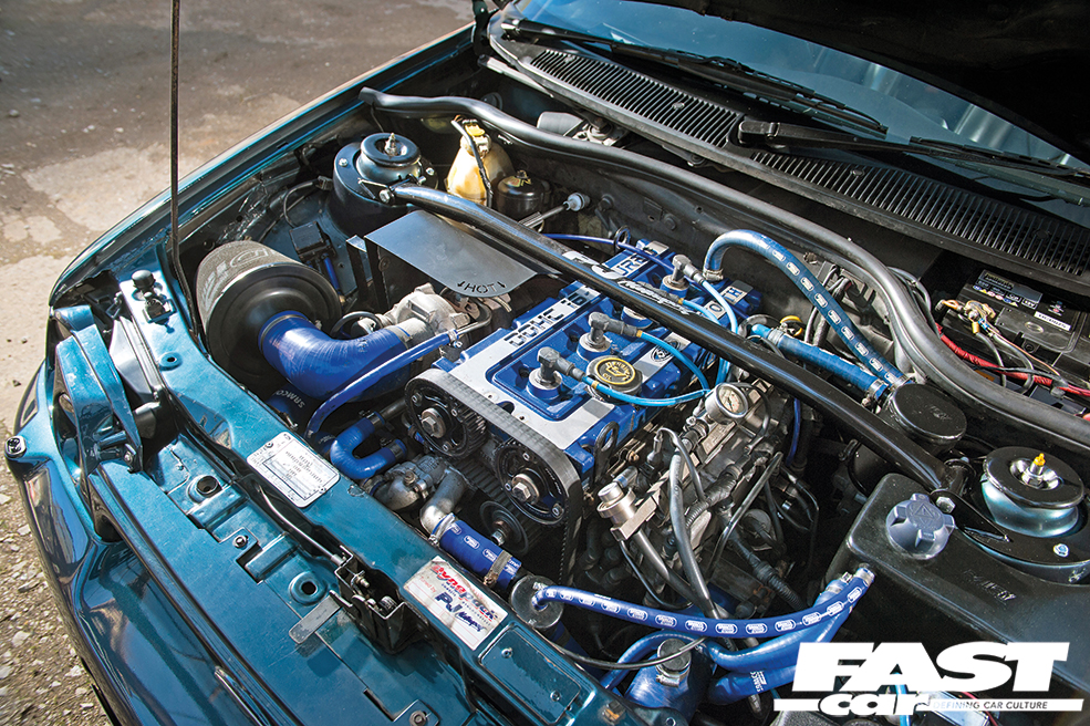 2.0-litre Cosworth YB turbo, Wossner pocketed pistons, WRC head gasket, ARP long studs, Turbosport BD14 cams with Piper vernier pulleys, Lucas 83lb injectors, Stage 1 T34.48 turbo with -34 actuator, HKS boost controller, RS500 intercooler