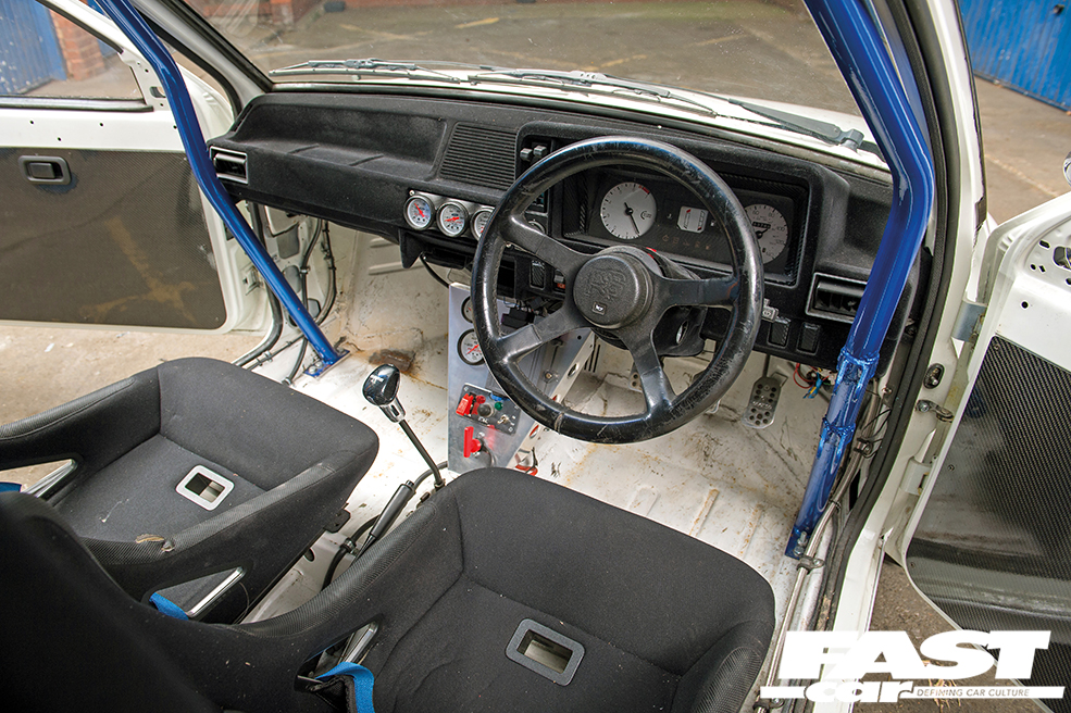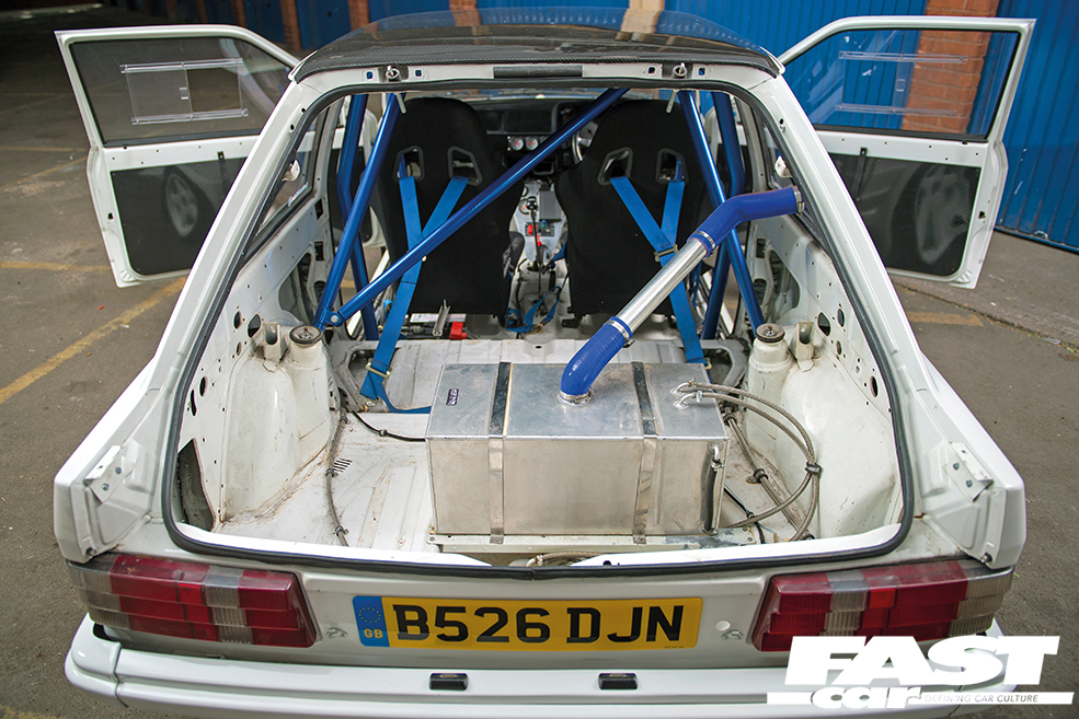 Fully stripped – no sound deadening or unnecessary weight, loom thinned-down, 6-point Safety Devices rollcage, battery relocated behind passenger seat, Cobra Monaco bucket seats with Willans harnesses, aluminium fuel cell in spare wheel well, inner door skins and internals removed, carbon fibre doorcards and door strap, flocked half-dash, 14in cage-mounted rear view mirror, custom centre console, Ford Racing gauges (boost, oil pressure, water temperature, volts, fuel pressure), push start button, RS 4-spoke steering wheel