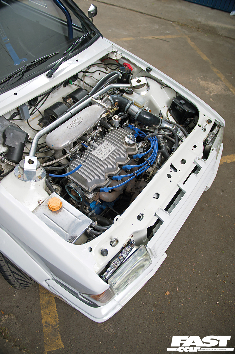 1900cc genuine American tall-block CVH, baffled sump, Stage 3 ported and polished head with oversized valves, CVH34 cam, double valve springs and vernier pulley, EFI converted, custom inlet plenum and fuel rail (designed by ‘Dave The Great’) with Cosworth FPR and Cosworth throttle body, Magnecor leads, Cosworth Bailey oil breather, water swirl pot, 82° thermostat, HKS blow-off valve, Garrett GT2860RS turbo (.68 rear housing), oil feed inline filter, custom 3in downpipe, Cosworth Group A K&N air filter, Transit Connect starter motor, custom aluminium radiator, 70mm intercooler, Mocal oil cooler with thermostat, RS Turbo fuel pump feeding swirl pot into Bosch 044 fuel pump, 470cc Astra VXR injectors, Boost Monkeys Gen8 ECU mapped by Dave at Allmotion Tuning