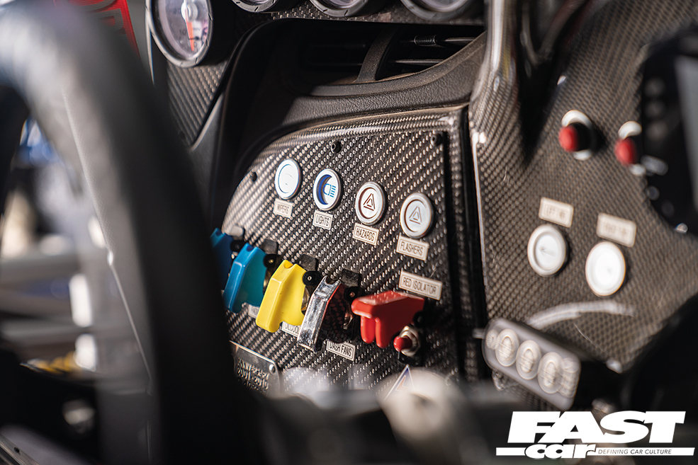 The cockpit is just as bright as the rest of the car with the interior being a blend of OEM Mazda and pure racecar. The standard FD dash has been retained and blended with a host of Angry Panda carbon fibre fascia and bezel panels. The compact AIM Strata dash, with its LCD display, shows all of the data from the Link ECU, and under all this sits an Autosport pedal kit with brake bias and remote reservoirs in the engine bay. The billet gear stick is made by Surefab in New Zealand and the bucket seats and harnesses are from Vello.