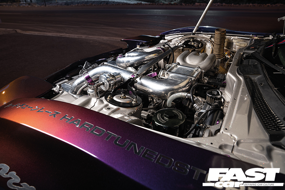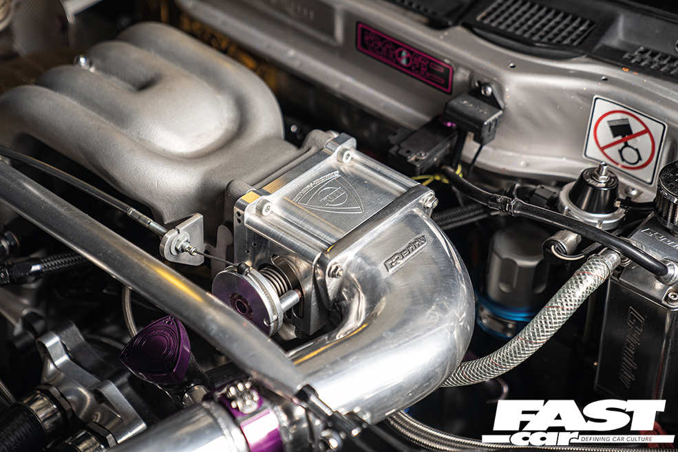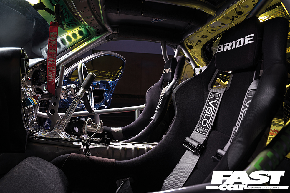 Behind that monstrous engine sits a billet twin plate clutch to help transfer the power though the sequential box. This spins a custom single-piece tail shaft into the Cusco MZ two-way LSD. The standard diff housing is strengthened by a laser-cut brace, which holds the front and the rear together to prevent the crown wheel and pinion “cracking apart like an egg”. This overall setup resulted in a 520whp – weapons-grade by anyone’s standards!