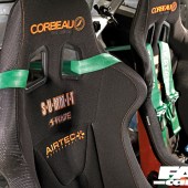Custom stitched carbon Corbeau bucket seats, five-point harnesses, Momo steering wheel, custom weld-in roll-cage, polycarbonate windows, Lifeline fire extinguisher system