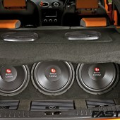 Focus ST-2, air vent-mounted boost gauge, short-shifter, three 12in subwoofers, Focal door speakers, 6x6in speakers in custom parcel shelf, two small Bass Face amps, one large Bass Face amp, Pioneer head unit