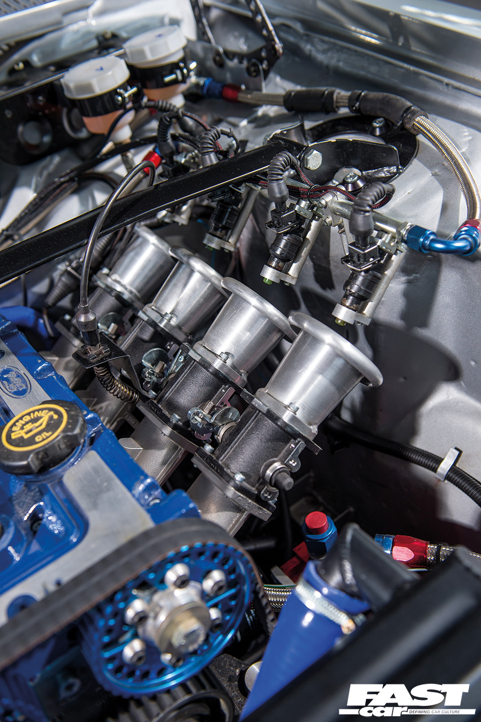 Due to competition regulations it was necessary to retain the Pinto block, so the choice was made to fit a naturally-aspirated Cosworth head, with a dry sump and throttle bodies. The engine was built up with a new crank, rods and pistons, along with custom cams and bigger valves in the racy head; its first dyno run of 2018 yielded an impressive 275bhp and 177lb.ft, which is a very fitting set of stats for such a dramatic rebirth.