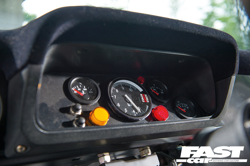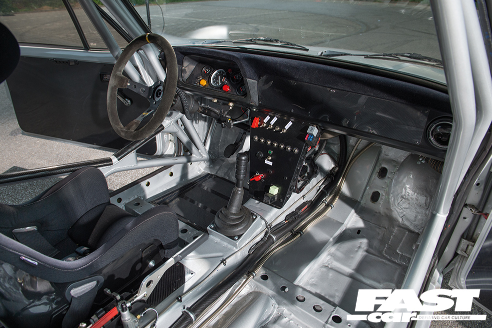 Corbeau Revenge race seat, VDO gauges, Stack rev counter, OMP steering wheel with quick-release, weld-in Zelle multi-point rollcage by raceparts.cc, battery and 18-litre alloy race fuel cell in boot