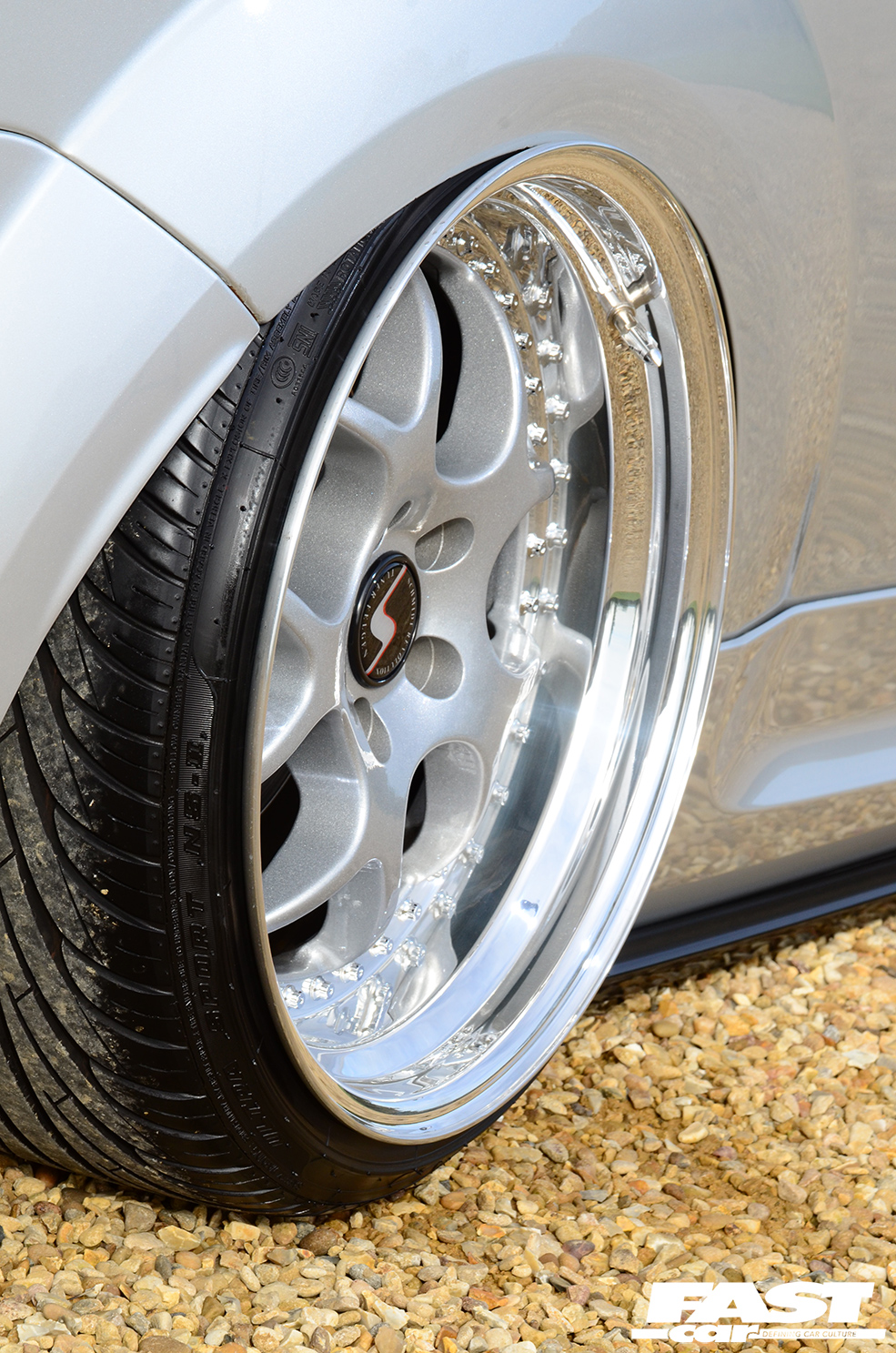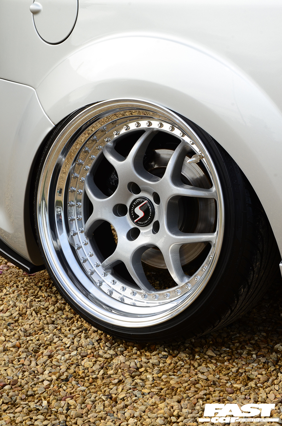 9.5x18in Schmidt VN-Line three-piece split rims finished with gloss black barrels, metallic silver faces and machine polished dishes; stainless steel split rim bolts; custom Schmidt gel centre caps; 215/40×18 Nankang NS-2R tyres; air suspension system (comprising Air Lift Performance struts, AccuAir e-Level management, twin VIAIR 444c compressors and five-gallon tank with aluminium hard lines); Powerflex front polybushed wishbones; Elevate rear anti-roll bar; gloss black/red Summit front upper strut brace; Summit upper rear strut brace; adjustable Hardrace camber arms.