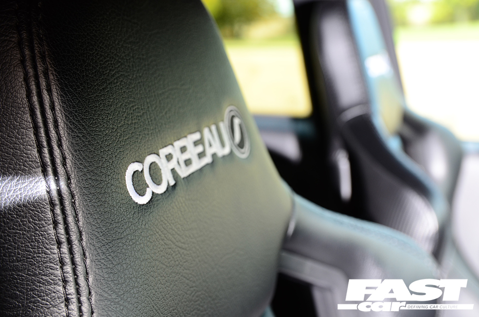Full face-lift carbon fibre interior swap with clocks and boost gauge; Corbeau Sportline RRS reclining bucket seats; custom boot build with false floor and storage hatch; Prosport air vent-mounted boost gauge; uprated heater controls.