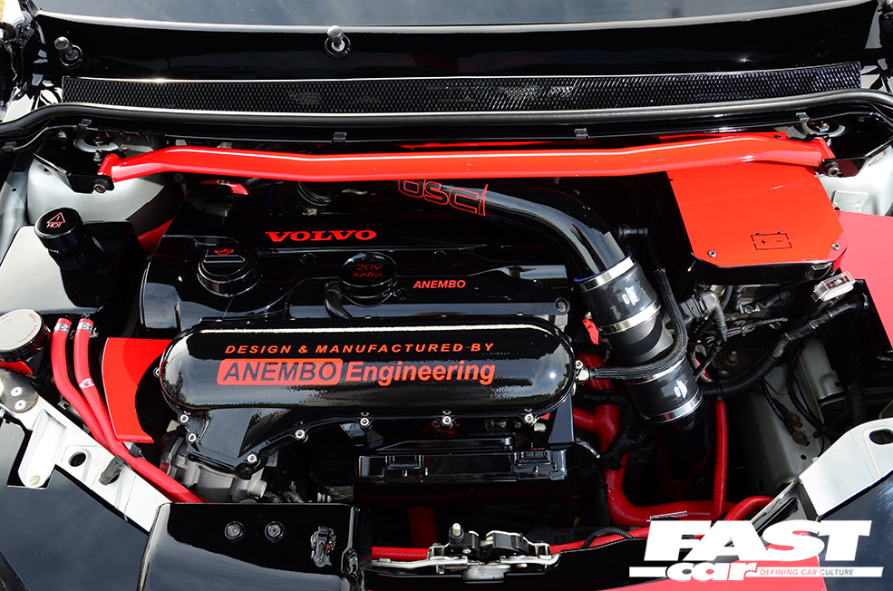 2.5-litre 20v five-cylinder turbocharged Duratec engine; Dreamscience cold air induction system with dry-charge filter; Dreamscience block mod; Stage 2 Airtec intercooler with RS scoops and grey detailing; 3in Mongoose downpipe and de-cat pipe with 3in Cobra Venom cat-back exhaust system and 4in inverted slash-cut tips; 440cc Focus RS fuel injectors; gloss black Anembo inlet plenum with red detailing; Forge Motorsport actuator and recirculation valve; Focus RS vacuum pipe; gloss black Focus RS ECU holder; gloss black Auto Specialists coolant tank and cap with red detailing; gloss black Volvo T5 engine cover with red detailing; gloss black and red symposer delete cover; gloss black RS battery cover; red SFS Performance coolant and boost hoses; all engine plastics painted gloss black with various chrome covers finished in Colorado Red and hand-painted detailing; Dreamscience Mod XRS+ V2 overrun re-map; six-speed manual gearbox; Focus RS clutch with single-mass lightened flywheel; Auto Specialists quick shift kit; Elevate gearbox torque mount.