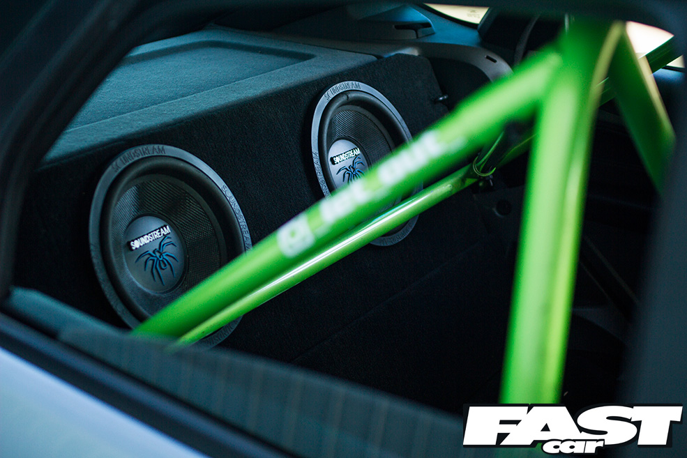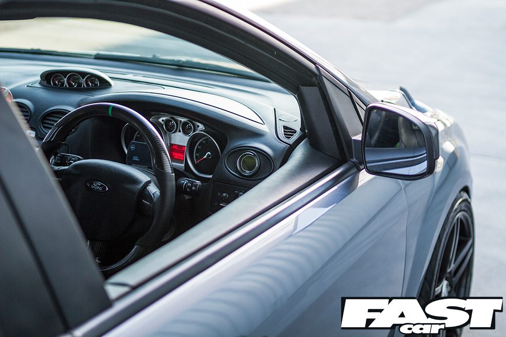 Ford Focus XR5 interior with rear seat delete, rear seat area carpeted, custom four-point bolt-in half rollcage in Ultimate Green, air conditioning delete, battery relocated to boot, replica Recaro Sportster CS front seats, Takata four-point harnesses, custom carbon fibre steering wheel, Mugen carbon fibre gearknob, vent-mounted Little Devil Fords air-fuel ratio gauge, GFB G Force 2 electronic boost controller, fire extinguisher and a pair of Soundwave 12 inch subwoofers, mounted in the rear seat position.