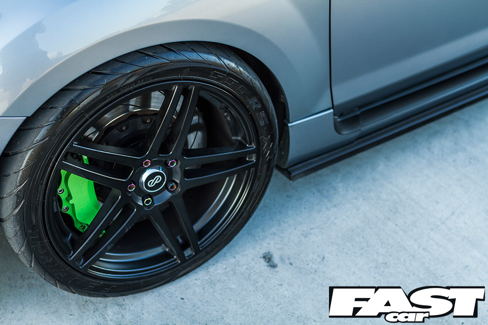 Enkei RSF5 18×8 inch alloys all-round with 235/40/R18 Federal RS-RR tyres all-round and 20mm Garage Line wheel spacers. At time of publication: Simmons 19×10 inch alloys all-round with 275/35/R19 Federal RS-RR tyres, Pedders Xtreme coilovers with 8kg front and 6kg rear spring rates, adjustable dampers set to 10 hard front and 12 hard rear, Mazda 3 MPS rear anti-roll bar, Summit Racing strut brace and Vibratecnics torque mount, K-Sport eight-piston front brake calipers in Ultimate Green, relocated vacuum hose and brake booster.