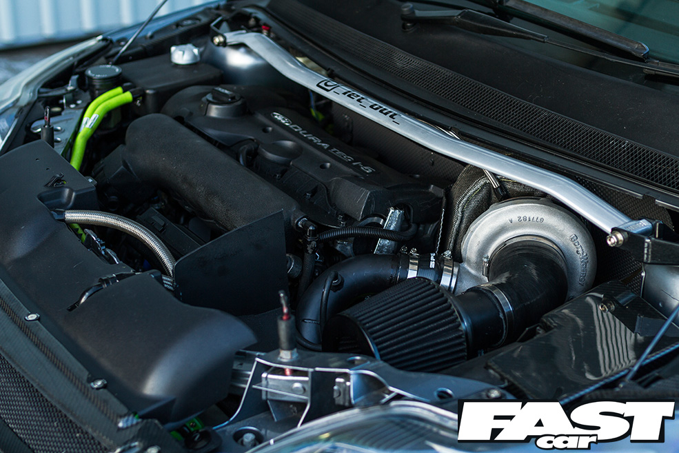 Ford Focus XR5 2.5-litre Duratec inline five rebuilt by Mostech Race Engines, fully blueprinted and balanced with custom machined Wiseco forged pistons, 7.9:1 compression ratio, Darton sleeves, custom deck plate, custom drilled coolant passages, K1 H Beam Forged Rods, Sitech Racing Custom Ground Cams, LG Racing stainless intake valves, Inconel forged exhaust valves, ARP head studs, Glyco big and main bearings, Piper titanium valve springs and retainers, 2XS Racing custom 3 inch alloy intake, custom alloy airbox, Borg Warner S300SX-60 T4 twin scroll turbocharger, Turbosmart hypergate 45mm external wastegate, 45mm screamer pipe, 2XS Racing custom 3 inch downpipe and 2XS Racing 3 inch turbo-back exhaust system, 2XS Racing custom sidewinder turbo manifold, Turbosmart Vee Port blow off valve, Aeroflow fittings custom braided turbo oil feed and drain, Dreamscience custom RS fuel hosing with upgraded pressure regulator, Walbro 460lph in-tank fuel pumps, 1000cc fuel injectors, 6AN custom black stainless steel fuel feed line with quick connect couplers, coolant line delete, Winner Racing alloy radiator, Pumaspeed coolant hoses in Monster Green, RDR front mount 19 row oil cooler, 10AN custom braided oil hoses, 2XS Racing custom 3 inch stainless steel hot side piping and 2.5 inch alloy cold side piping, 2XS Racing modified coolant rail, Forge Motorsport race intercooler, Sitech racing plenum, Auto Specialists alloy header tank, Auto Specialists injector rail cover, Auto Specialists billet oil, washer, power steering and dipstick caps, carbon fibre fuse box lid, wing trims and backing panels, RDR oil breather kit, gas bonnet struts, black stainless steel braided vacuum hoses and tucked engine bay wiring, 430.6whp, dyno tested at 24psi.