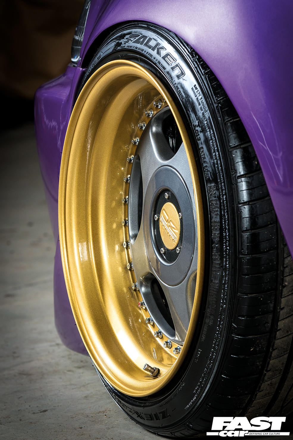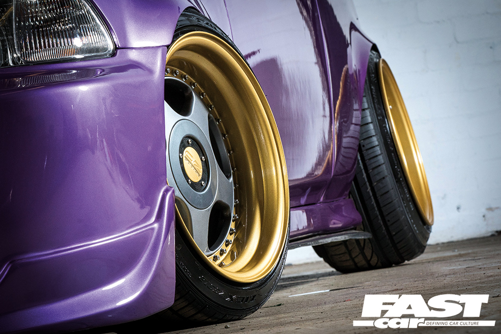 Custom OZ Futura three-piece 9.5×16 ET13 (f) and 10.5×16 ET13 (r) split rims; BC Racing fully adjustable coilovers; Cusco carbon front brace; fully polybushed chassis; fully powder coated subframe and suspension components; custom front upper adjustable wishbones; D2 rear camber arms; D2 lower control arms; C-pillar tie bar; custom B-pillar tie bar; rear top-mount strut brace; ASR subframe; Beaks lower tie-bar; 6-pot Wilwood front callipers 320mm discs; 320mm Wilwood rear discs and single pot callipers; custom pink braided brake lines.
