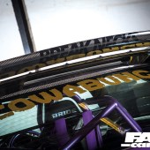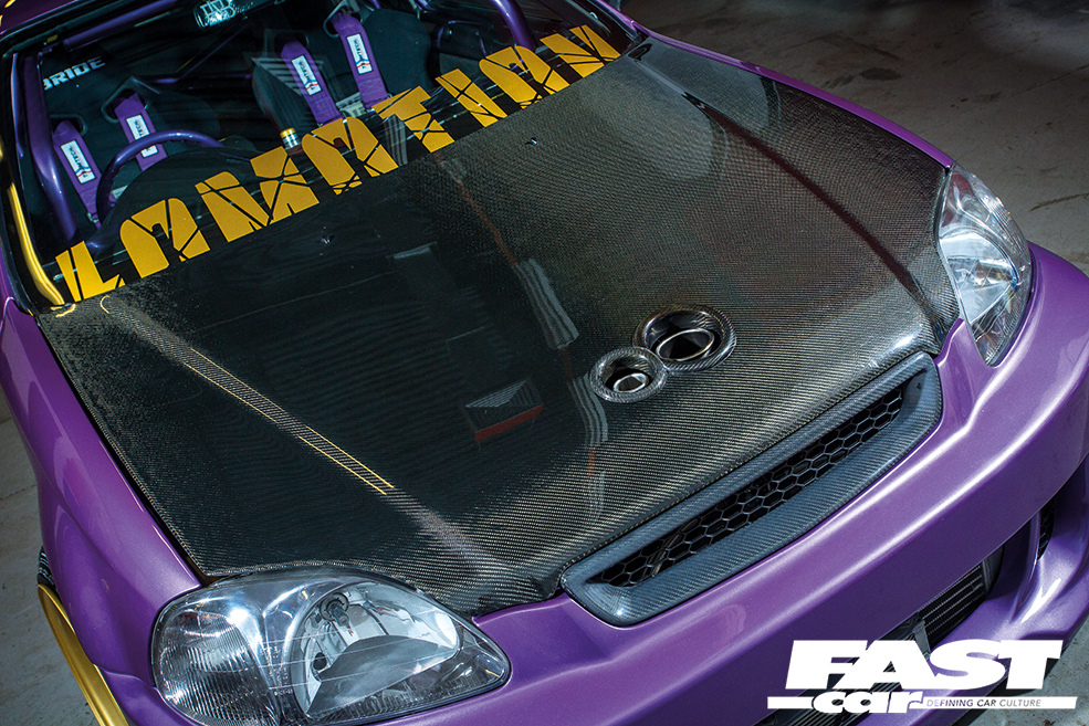 While the engine was out, Shaun got busy prepping the rest of the car. He spent a long time learning how to plastic weld so he could customise a S2000 AP2 front bumper. The rear bumper was given similar treatment, having an EP3 rear lip and EVO10 diffuser all blended together, as well as removing the exhaust port as there ain’t no need for it! Along the sides you will find much smoothing, as well as EVO8 side skirts. Bolt on bits include an EK9 tailgate and lights, as well as lots of carbon items, such as the bonnet, mirrors, grille and that awesome rear spoiler on custom mounts.