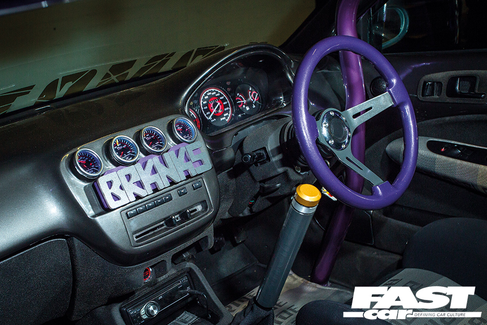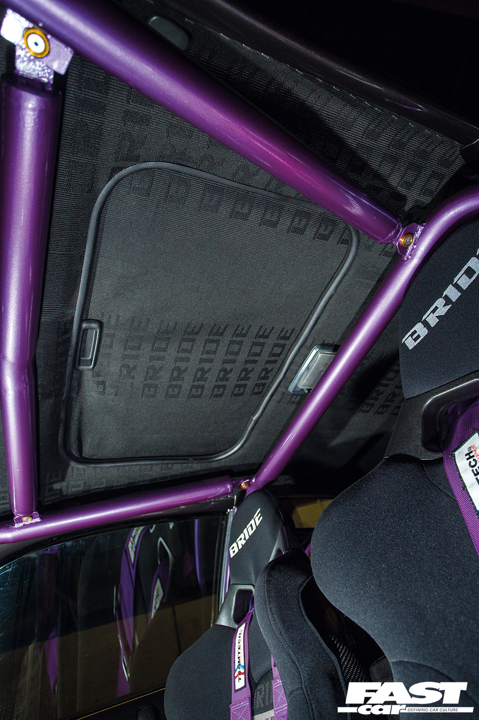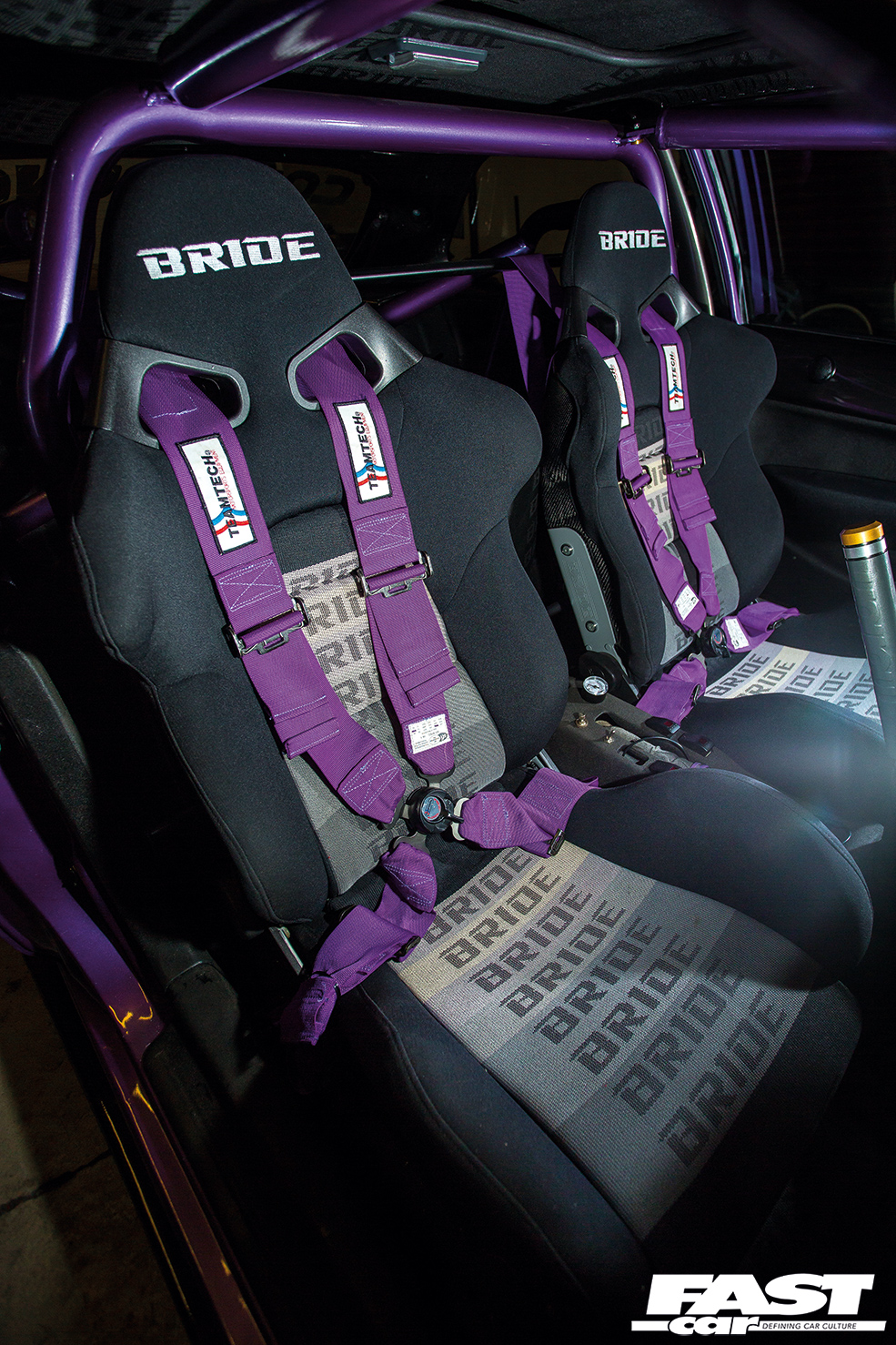 Bride Cuga carbon recliner bucket seats; Team Tech 4-point harnesses; Mugen shift knob and extension; purple wood steering wheel; NRG quick-release boss; custom harness bar; custom 6-point roll cage painted in Donatello Purple; fully smoothed dash and trim; custom gauge pods and heater unit; oil temp,