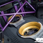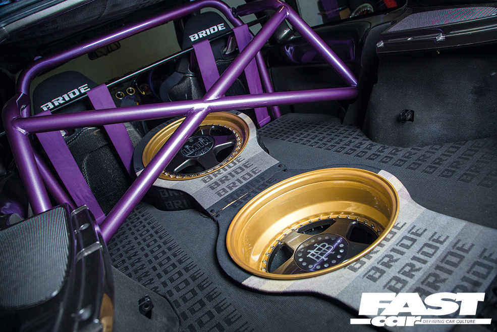 The interior work was extensive too, as Shaun describes: “Everything was either re-trimmed, flocked or painted and nothing escaped”. A glance inside confirms this. Bride material covers most of what you see, such as the door cards, mats, roof, boot install and, er, the Bride Cuga seats. The dash is flocked and smoothed with custom gauges while purple colour coding on the roll cage, steering wheel and harnesses really brighten it all up. The tidy rear install boasts two spare wheels, no seats and guess what – no air tank! Yes, that’s because this beast is static. Wow!