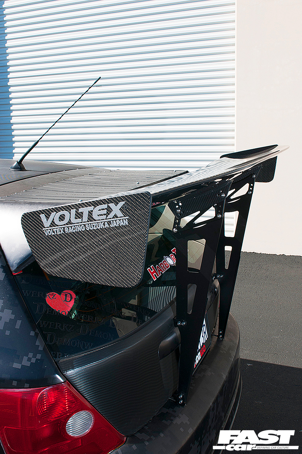 JDM CTR front bumper, sideskirts, grille, side markers and Honda badges, JDM Mugen Lip , USDM CTR rear lip, shaved rear bumper lens, Mugen-style hood and spoiler, JDM window visor and slam panel, Depo 04-05 CTR repilca headlights, R-Krew canards, APR custom splitter, Voltex Type 7 1600mm wing, PCI custom wing stands
