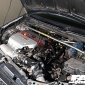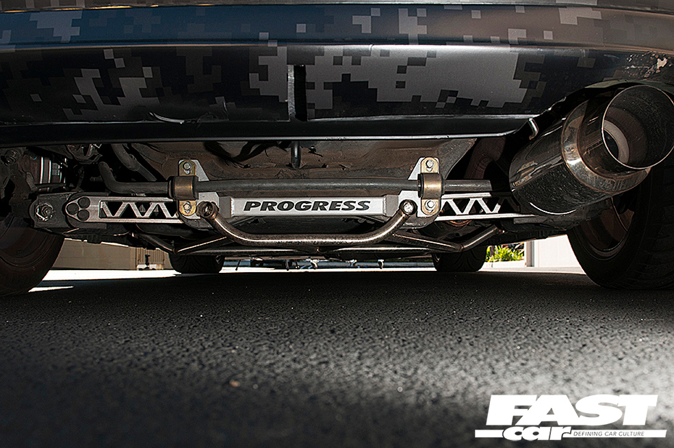 bearings, hard bushing set, front and rear endlinks and rear camber kit, SPC front camber bolts, Buddy Club roll centre adjuster, Todd’s adjustable tie rods, T1R Racing inverted tie rod ends, Neuspeed front strut tower bar, Mugen H-bar, Spoon rear strut tower bar, EM2 front sway bar, Progress rear sway bar with tie bar, Function 7 rear LCA, D3 rear V brace