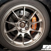 9x17in WedsSport TC105N alloys, Federal 595 255/40×17 tyres, ARP extended studs, ‘04 RSX-S 5-lug conversion, Buddy Club big brake kit, Raybestos ST43R front pads, Goodridge stainless braided lines, Power Slot slotted rear rotors, Hawk HP+ rear pads, Buddy Club race-spec damper coilovers, Swift Springs 14k front and 20k rear, Hard Race LCA spherical