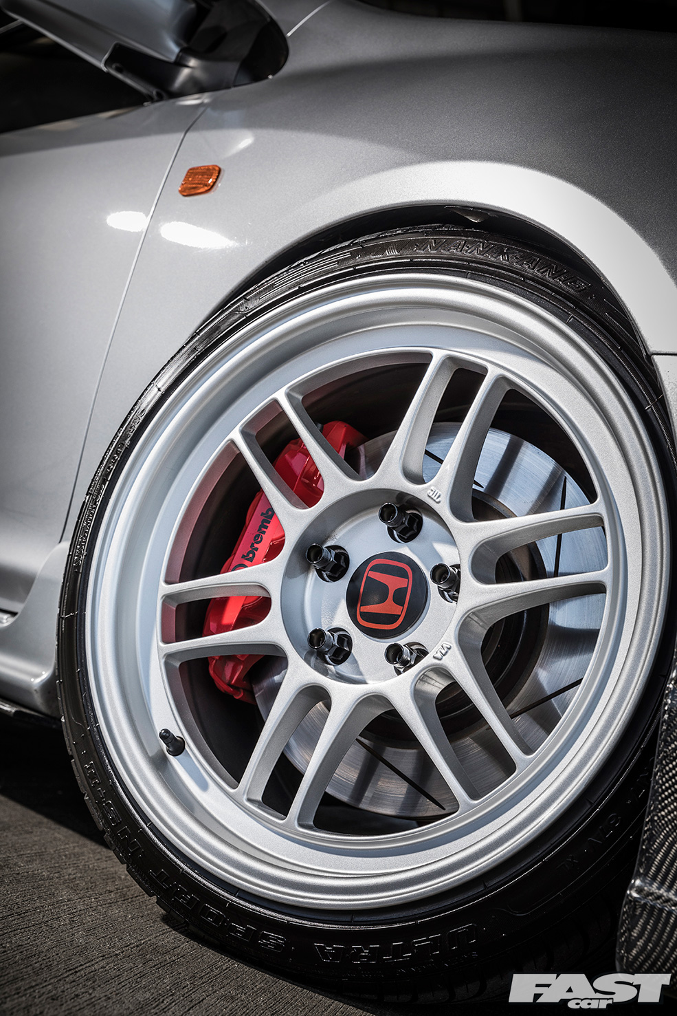 9x17in Japan Racing JR7 alloy wheels; 15mm hubcentric spacers all-round; 215/40×17 Nankang NS2 tyres; MeisterR adjustable coilovers; Powerflex camber bolts; rear camber arms; Energy Suspension polybush kit including engine mount inserts; Powerflex gearbox mount insert; Skunk2 lower control arms; Comptech tie bar with 24mm anti-roll bar; JDM EP3 front anti-roll bar; Tegiwa front strut brace; Carbing rear strut brace; custom C-pillar brace; K-System Brembo four-pot front brake conversion with 324mm discs and Brembo pads; OEM rear brakes.