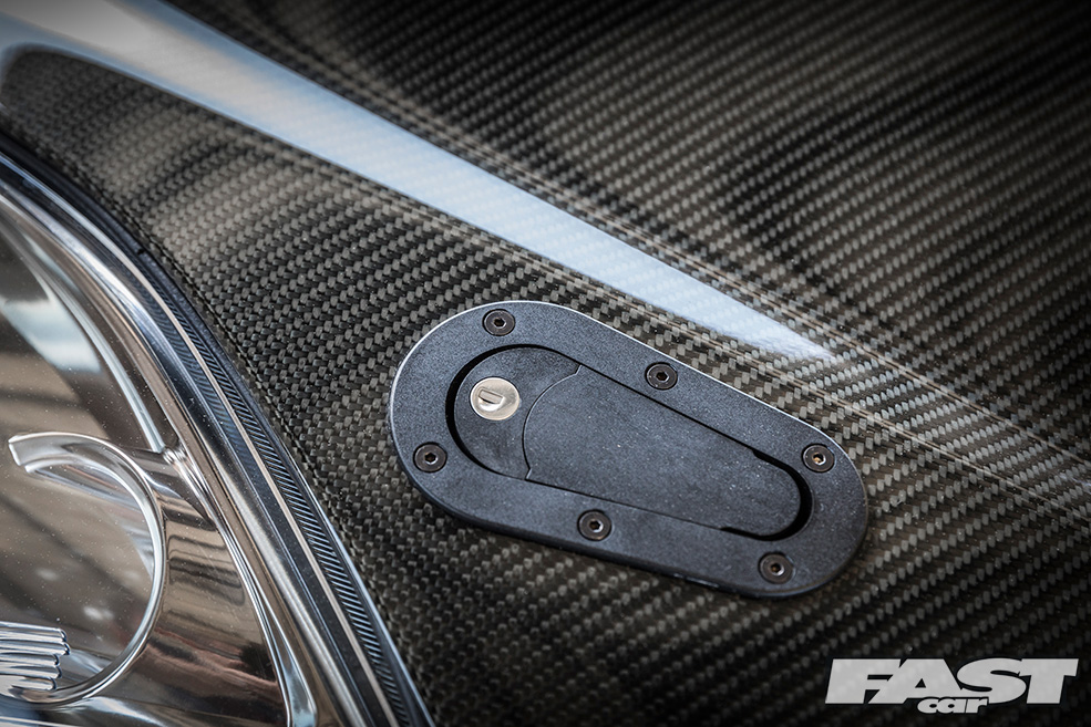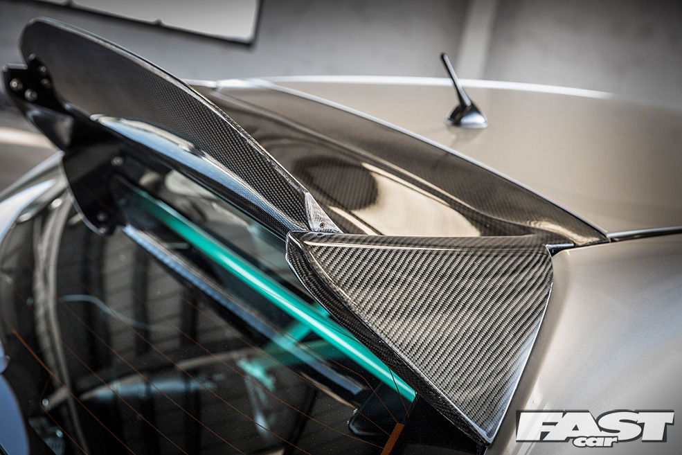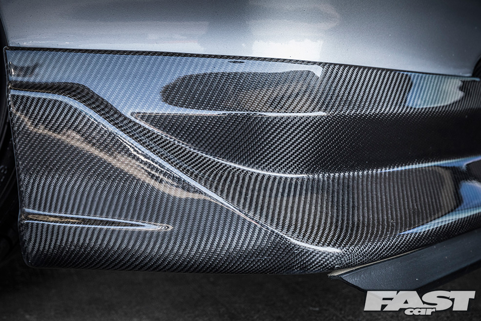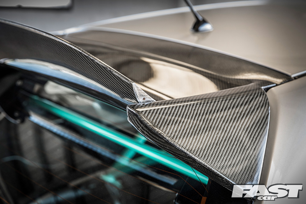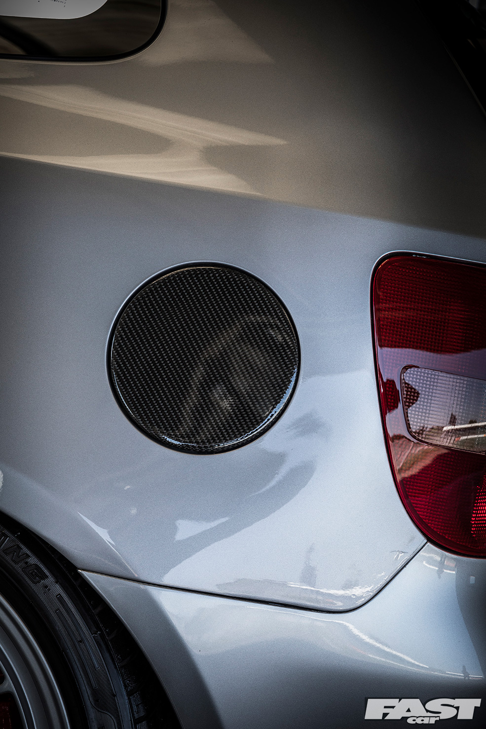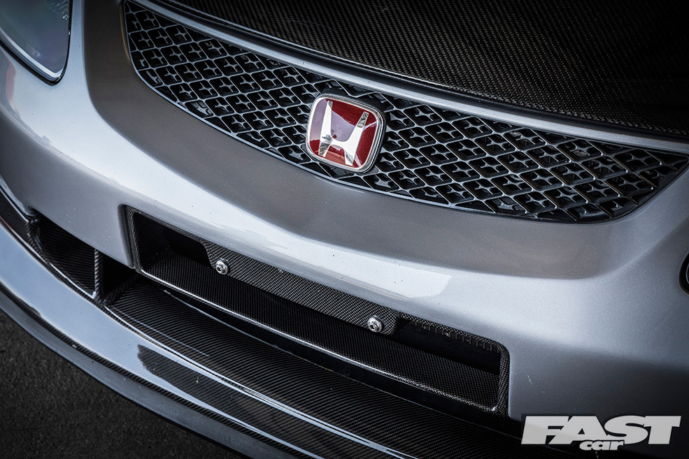 Carbon fibre Airwalker front splitter; carbon fibre Mugen-rep radiator duct; BYC rear bumper air release diffuser; custom side skirt extensions; Tegiwa OEM-shape carbon fibre bonnet; carbon fibre boot lid; carbon fibre Mugen-rep rear spoiler on custom tilt bracket with polished Downstar hardware; carbon fibre fuel cap; BLOX mini aerial; orange side repeaters; rear wiper delete.
