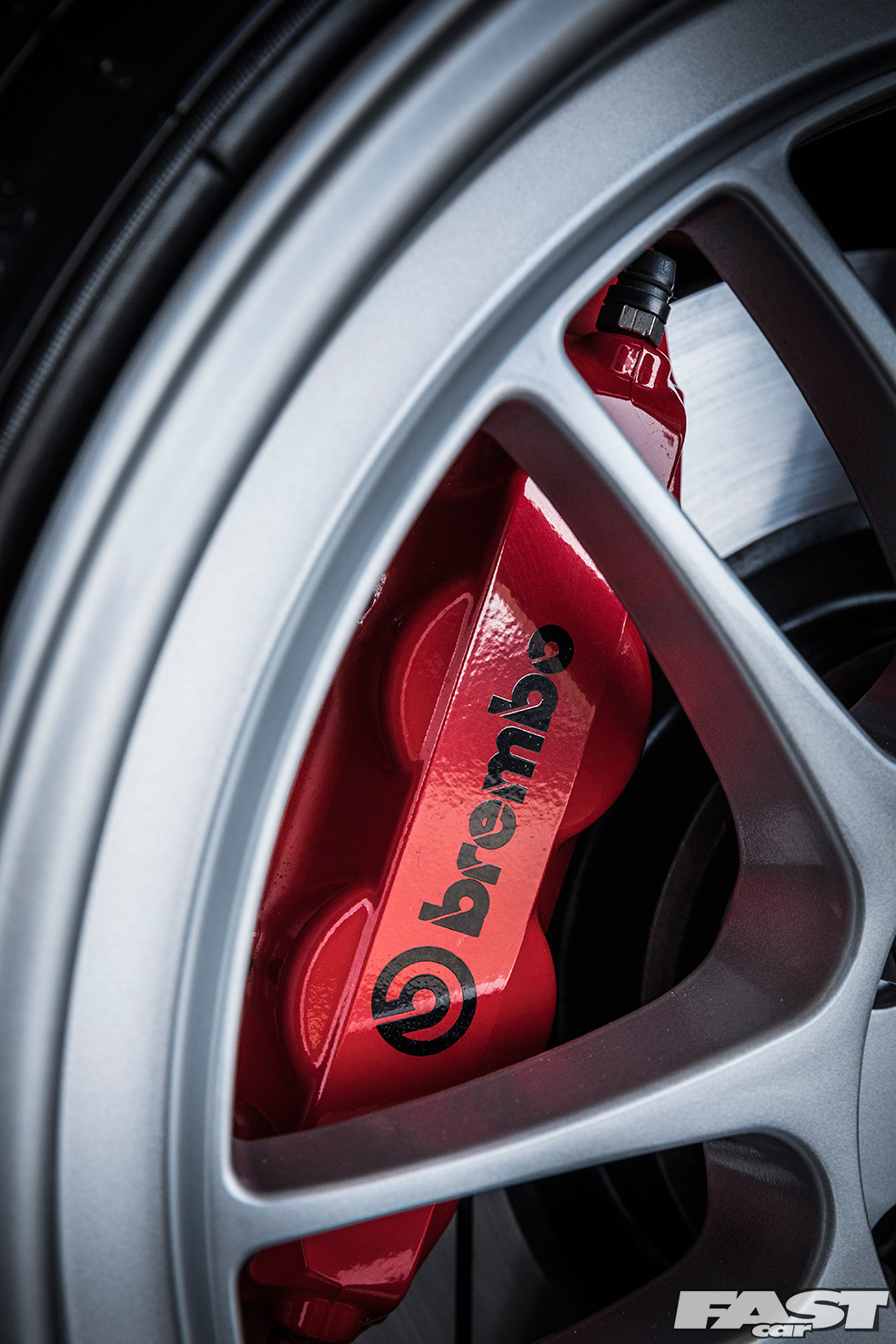 They have since treated the silver exterior to plenty of additional goodies to help signify this special beast from the rest. You’ll probably have noticed the sea of genuine carbon fibre panels that contrast the bright bodywork, for example, as well as those Japan Racing alloys that house a huge Brembo brake kit on the front two corners, all helping the overall product to look nothing short of delicious.