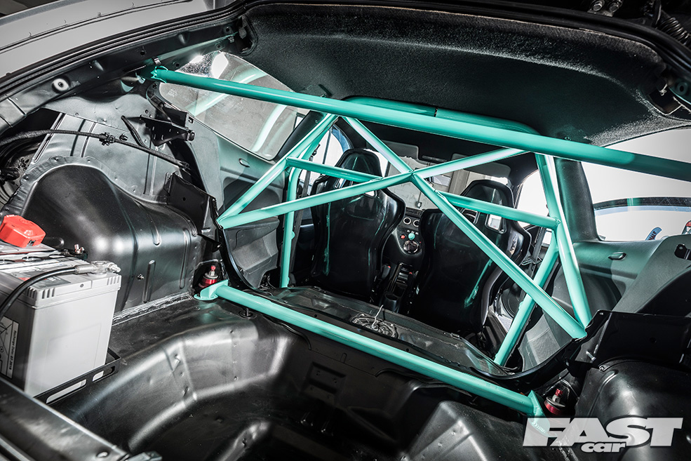 “It was when my nephew Connor got to an age where he became interested in cars, and kind of took over the project for me by doing what he wanted, that things began moving again,” Chris smiles, happy to have his teenage sidekick on board to bring an entirely new perspective to the build. One of the first things on Connor’s long to-do list was to strip the interior and add a roll cage. Not wanting to leave any rough edges, some of the trim remained while Chris painted the floor itself satin black. They didn’t leave the Safety Devices cage untouched, either. The creative duo sprayed it up in that stunning teal color that matched one of Connor’s Nike trainer boxes, offering a huge contrast to the silver bodywork in the process.