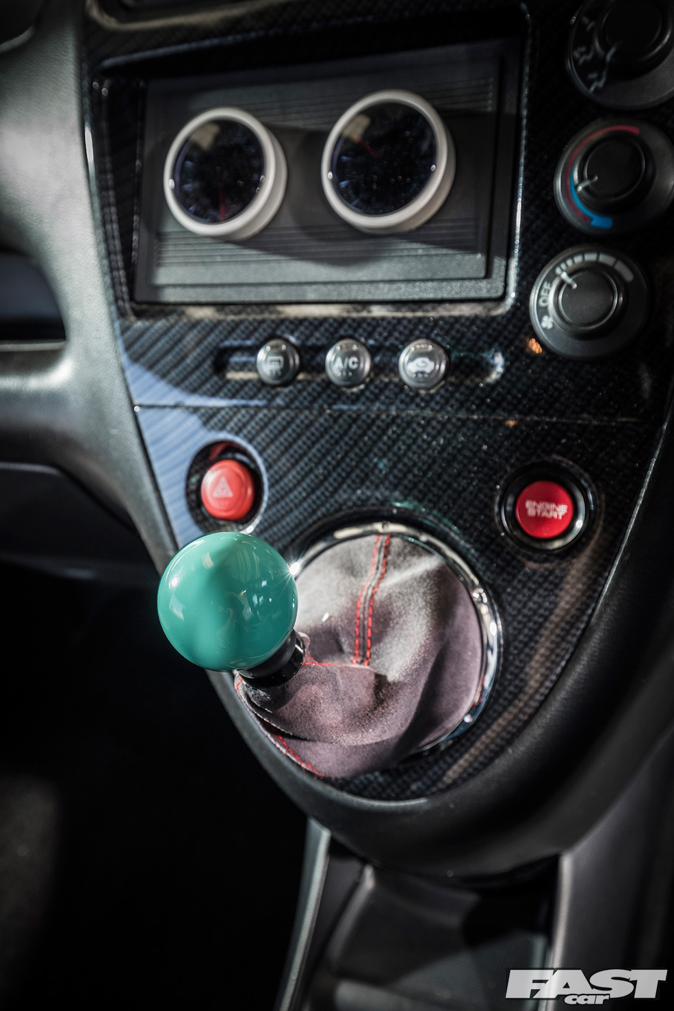 To top off the racier innards, Connor’s clear visions next got him looking at some fixed-back bucket seats to keep both himself and Chris in place during their rolling adventures. Eventually settling on some super-supportive Sparcos that matched Chris’ budget, as well as touches like a Personal steering wheel and an Alcantara gear gaiter, Connor’s design philosophy successfully knocked years off this hatch’s aesthetic for the better.