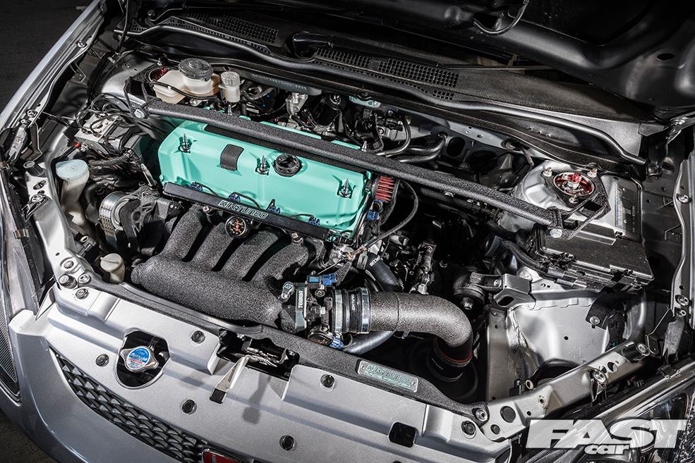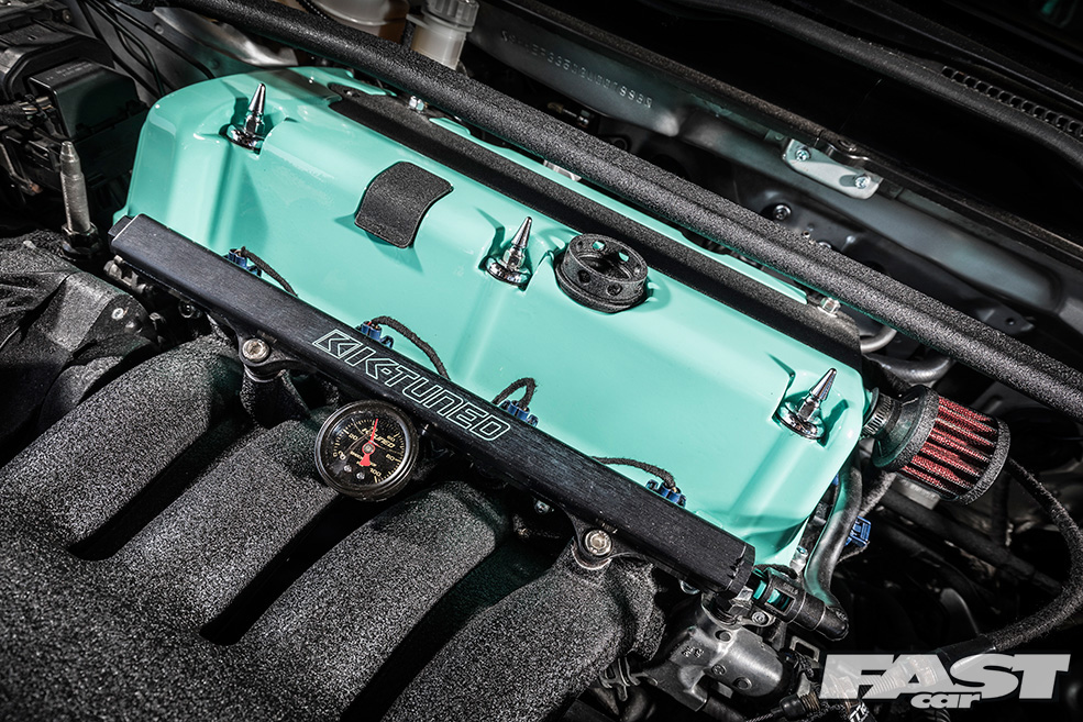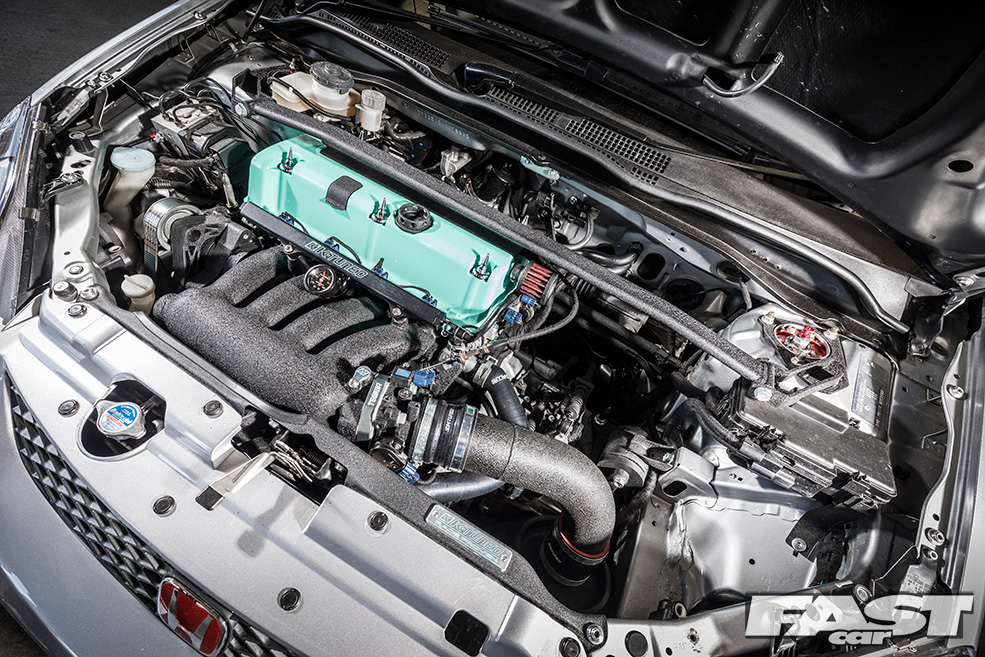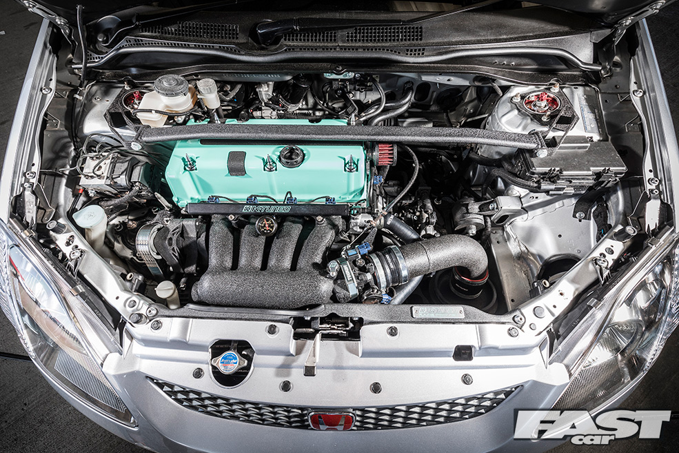 2.0-litre K20A2 i-VTEC DOHC engine; K-Tuned custom induction kit with pipe and 3in filter; RBC inlet manifold with thermal gasket and relocated brake booster; Tegiwa throttle body adapter; K-Tuned MAF plug; K-Tuned fuel rail with pressure gauge; Tegiwa 4-2-1 exhaust manifold; stainless steel unsilenced exhaust system with HKS back box; K-Tuned coupling hoses; Downstar rocker cover spikes; 6two1 oil cap; flush-fi t dipstick and spark plug cover; BuddyClub radiator cap; Hondata KPro V4 ECU.