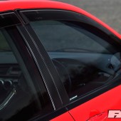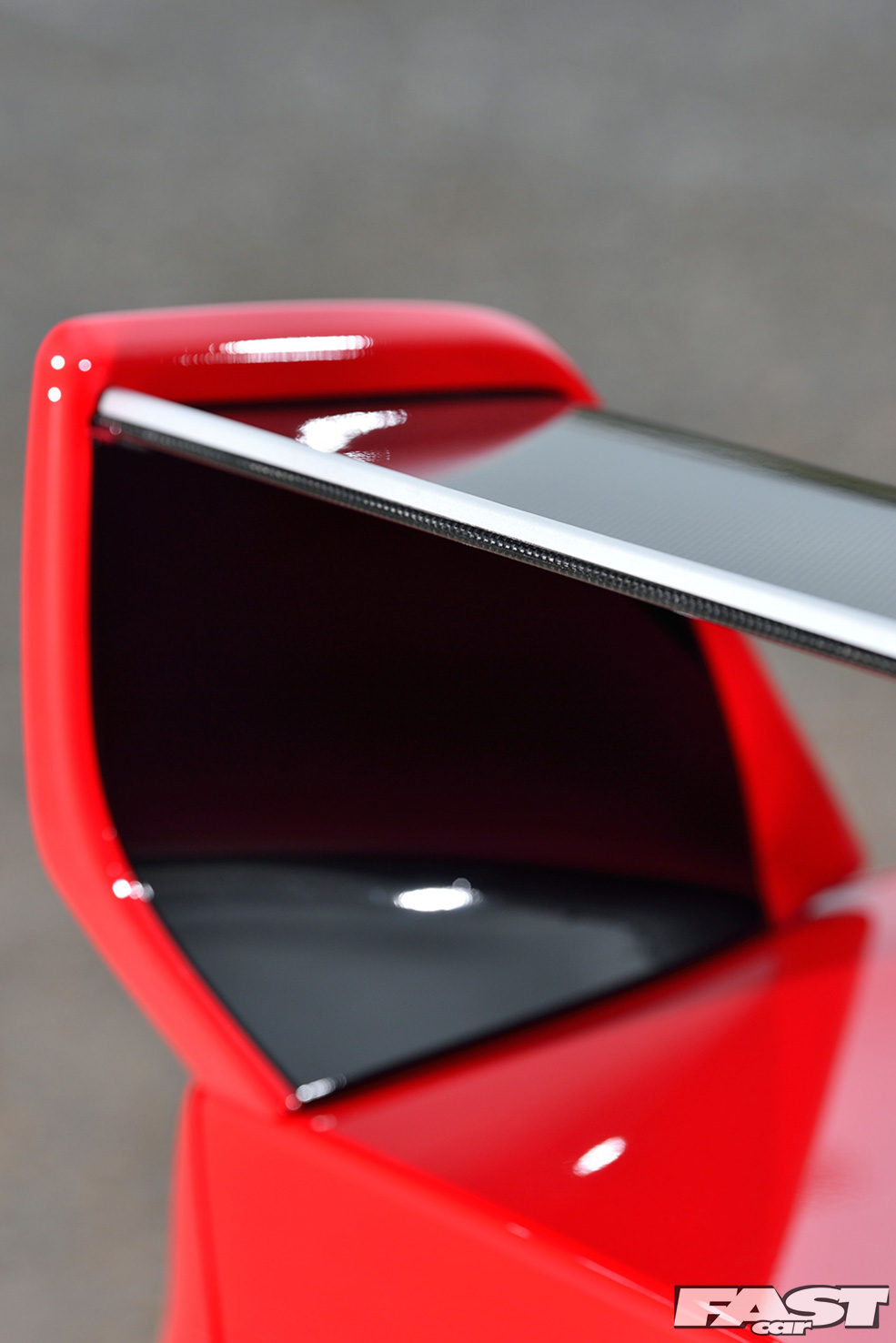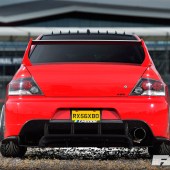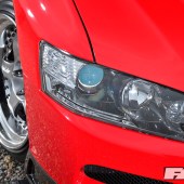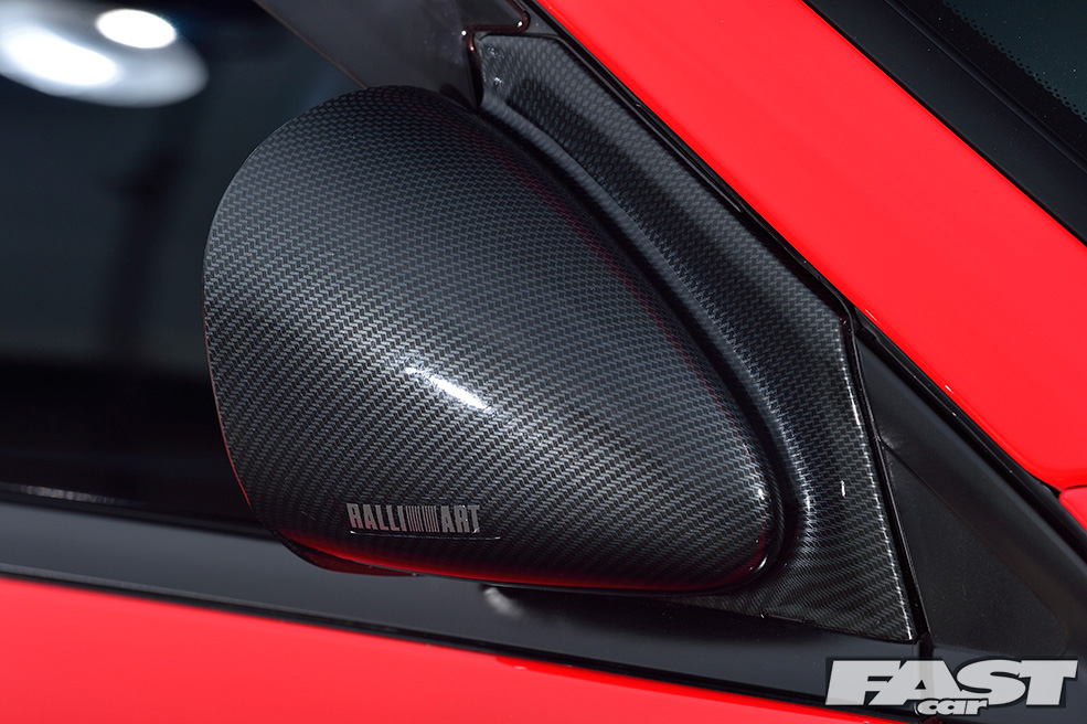 OEM Palma Red paint; gloss black wrapped roof and OEM vortex generator; Rexpeed carbon fibre MR front lip; APR front splitter; Rexpeed sideskirt extensions; Rexpeed carbon fibre rear bumper extensions; Varis rear bumper extensions; Varis Type II carbon fibre rear diffuser; Custom Carbon rear bumper and diffuser cover; Ralliart Evo VIII FQ400 wing mirrors; DIY rolled arches; Carbon Goodies front badge; simplified front grille; bonnet vent rain guard removed; de-tango’d OEM HID headlights with LED side lights; LED numberplate lights; USDM rear light clusters; USDM rear number plate with GReddy frame; inner rear wing mounts wrapped gloss black; tinted sunstrip; tinted front windows to match OEM rear tints; de-wipered; Mitsubishi tinted wind deflectors.
