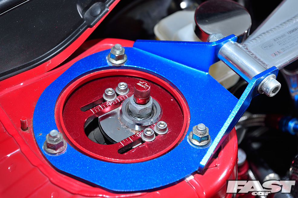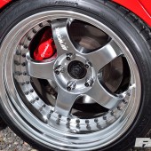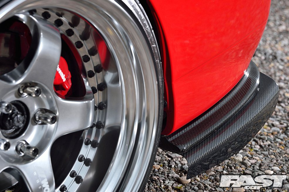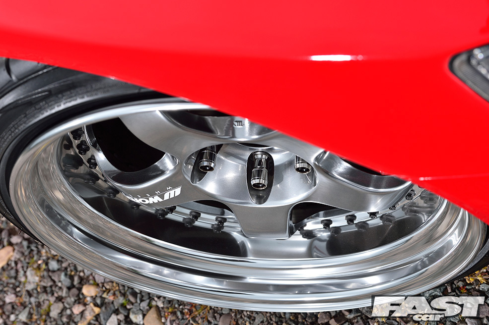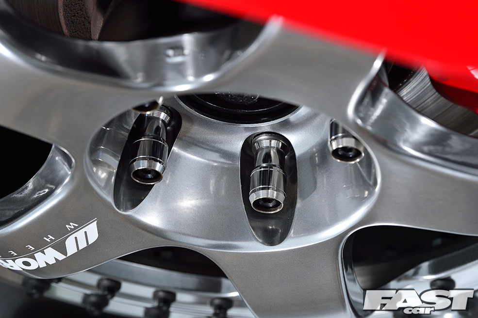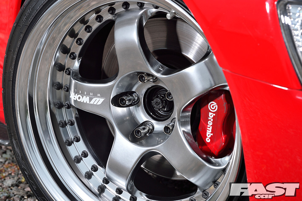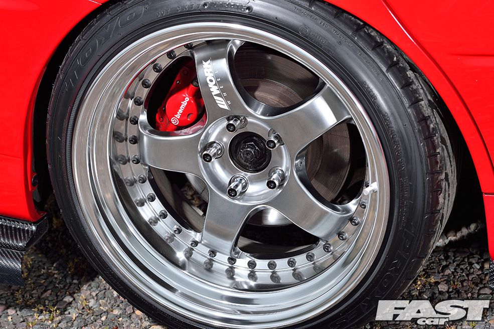 What really attracts crowds to Aaron’s Evo is the way it looks. Those Work Meister S1 split-rims are the motoring equivalent of a diamond ring. They’re shiny, expensive and bound to make girls cry with joy. Probably. Aaron did flirt with a set of 9.5x18in Rota D2EX rims before upping his game and splashing out on one of the most iconic wheel designs of all time. He rolled the arches himself to make room and had to get his head around the quirky Work dish system.
