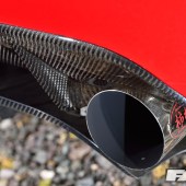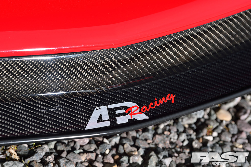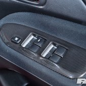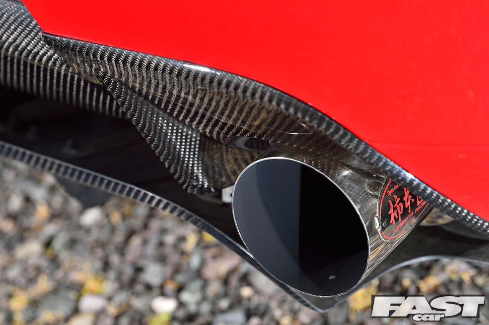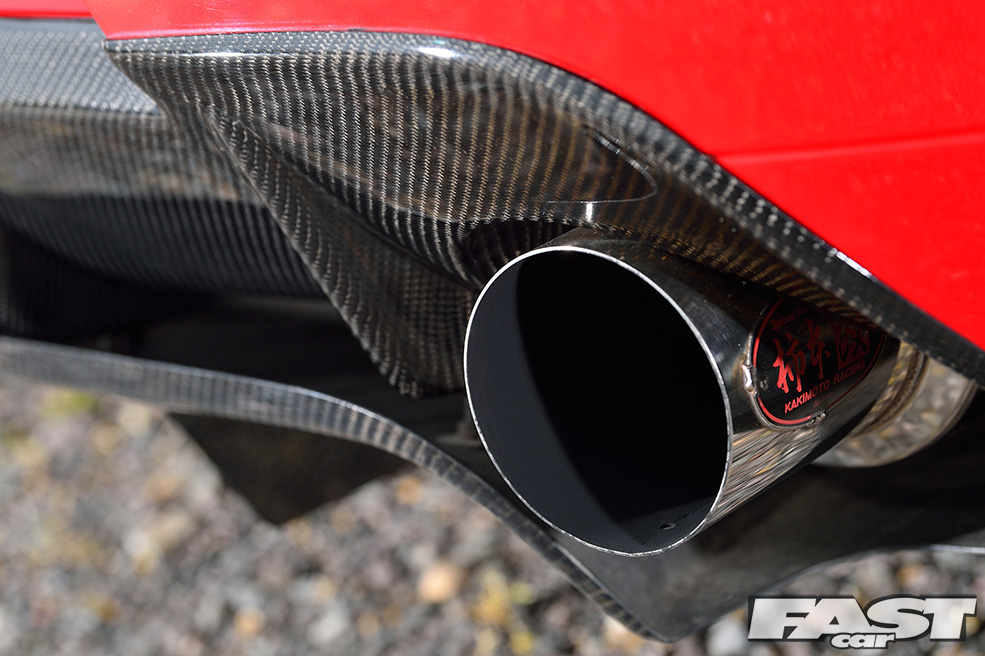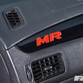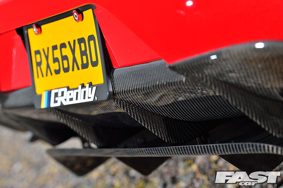 His first mod on the cleverly restyled exterior was the Rexpeed carbon fibre front lip from Carbon Goodies and the theme grew from there. He got a mate to wrap the roof in gloss black, including the original MR vortex generators. The rear lights are from a US-spec car and Aaron has de-tango’d the headlights to match. Round the back, Aaron has picked out the insides of the spoiler mounts in black to complement the Custom Carbon rear diffuser cover. He’s also added Varis rear bumper skirts on top of Rexpeed ones, to visually lower the car.