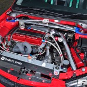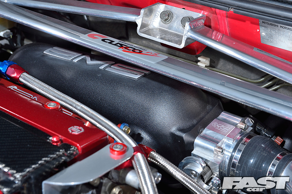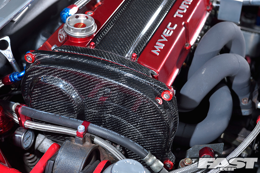 4G63T 2.0-litre 4cly 16v turbo engine; Link G4+ ECU fitted and mapped by Indigo GT; anti-lag and launch control; OEM TD05-15G turbo; standard internals; JM Fabrications large-runner stock-frame exhaust manifold Zircotec coated in Primary Black; JMF external dump elbow; 3in straight-pipe Kakimoto exhaust; GReddy 3-port boost solenoid; A’PEXi air filter with custom 80mm intake pipe; custom 2.5in intercooler piping; GReddy intercooler core; AMS F1-I inlet manifold; S90 throttle body; TurboSmart BOV; 1,000cc fuel injectors; AMS fuel rail; Sytec fuel pressure regulator; custom coil-on-plug conversion; custom breather setup with AN-8 fittings and braided lines; Mishimoto Evo 4/5/6 radiator with SPEC-R top hose; HKS radiator cap, alloy radiator mounts; Forge Motorsport power steering and coolant reservoirs; HKS oil cap; Frontline Fabrication billet aluminium dipstick, cam position sensor heat-shields, carbon fibre bonnet struts, cooling plate, cam cover, plug cover and fuse box cover; engine wiring loom relocation; battery relocated to boot; Tegiwa bolt dress-up kit; removed SAS; A/C and PAS cooling loop; IC spray system; radiator fans; charcoal canister and various solenoids removed; OEM 6-speed gearbox.