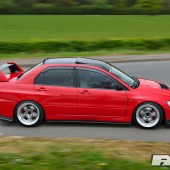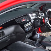 Considering how many Evos are dotted around the show scene, we’re impressed that Aaron has managed to make his car stand out without resorting to a lairy paintjob or wrap. Yet stand out it does. Parked up alongside other Evos you can really see the extra girth. By fitting Meister R coilovers and dialling in four degrees of negative camber, he’s stanced his car without killing the handling.