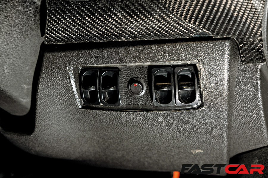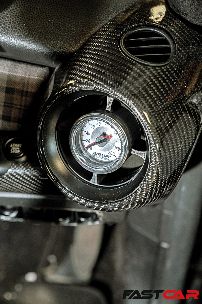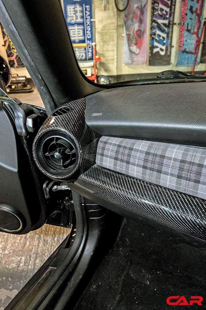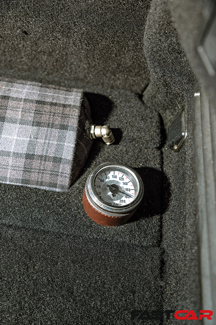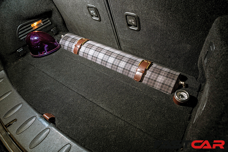 The attention to detail inside is similarly strong. When he bought the car, Sam was perfectly happy with the stock cabin and had no plans whatsoever to upgrade it, but obviously, he’s been busy with that too and has absolutely bossed it. The dash and steering wheel have been artfully reworked in the unusual mix of carbon fibre and tartan, the OEM steering wheel cunningly reshaped, while a custom headlining echoes the design of the exterior panel above. The boot build took a lot of thought and planning too, as he wanted the car to remain practical for load-lugging, and the air install has been tastefully trimmed to look like luggage. “All the carbon work and steering wheel reshape I learnt and did myself, same with the headliner,” he says. “The cabin is still something I’m slowly deciding what to do with – more interior modifications are top of my list!”