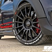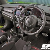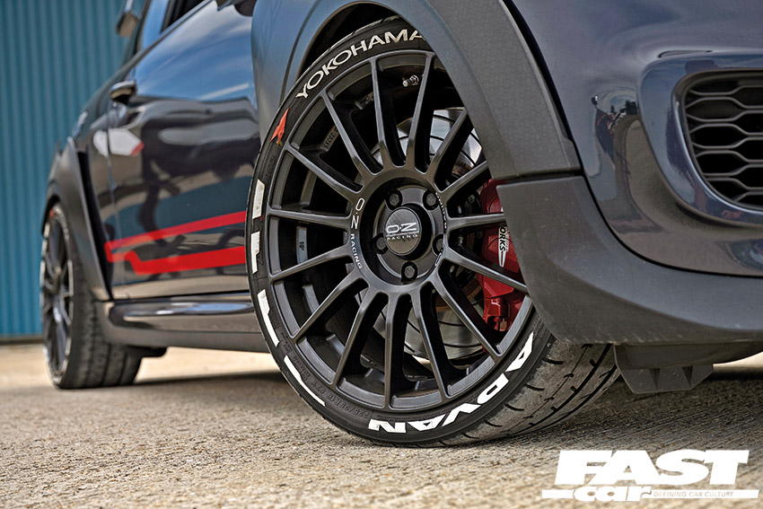“To be honest, I’m not a fan of the stock wheels, so I was always going to change them, but due to the massive calipers it limits the choice somewhat if you’re going to keep to the stock 18” rim size. I actually had chosen a different set of OZs for the car, however, they wouldn’t have cleared the calipers, so I settled on the Superturismo LMs,” he says, which the car still wears now. It might not have been Aaron’s first choice, but this is an iconic motorsport-inspired wheel, and it looks great, it suits the GP3 perfectly and with a set of 15mm front and 20mm rear Eibach spacers fitted, the Mini’s arches are filled out to perfection. With carbon-look centre caps and white lettering, these OZs have got attitude to spare and that’s further enhanced by the lettering on the sidewalls. This lets you know that Aaron is running a set of super-sticky Yokohama A052 tyres, and while the tyre stickers certainly won’t be to all tastes, we reckon they fit perfectly with a track build like this.