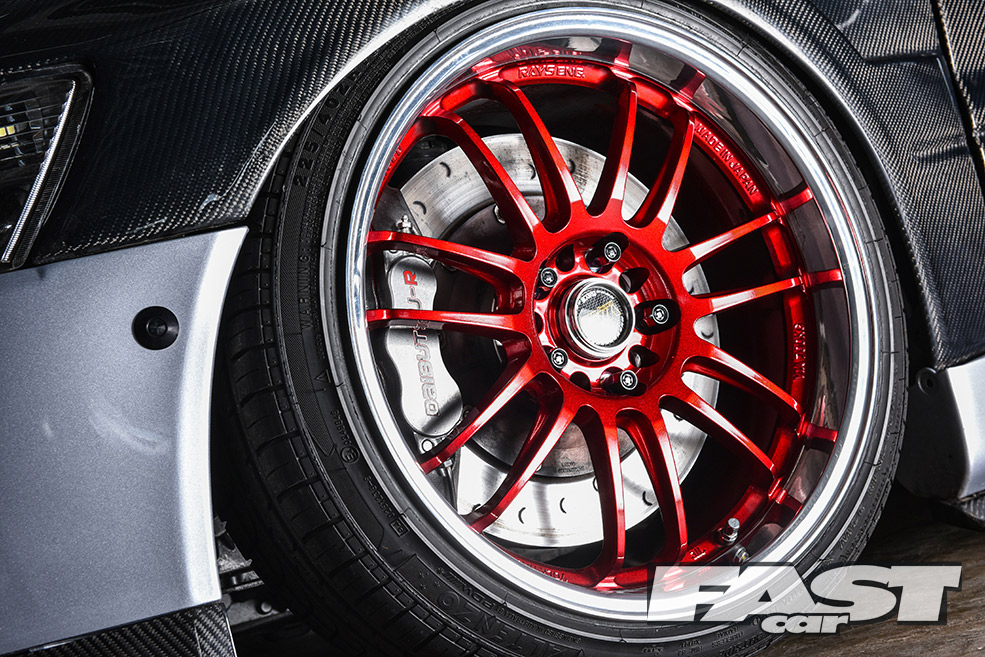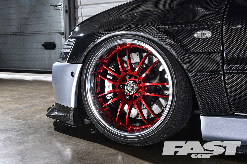 9.5x18in Volk RE30 forged one-piece wheels in custom candy red, Air Lift Performance Series airbag suspension with V2 management, Whiteline roll-centre kit, Whiteline adjustable front droplinks, Whiteline front and rear anti-roll bars, custom rear camber arms, race-spec rear toe arms, HKS Kansai front and rear struts, fully polybushed, Evo X FQ-400 365mm discs with Alcon calipers and XP8 pads, full-race brake setup – ABS and servo delete, HEL braided brake lines, OBP in-car brake bias valve