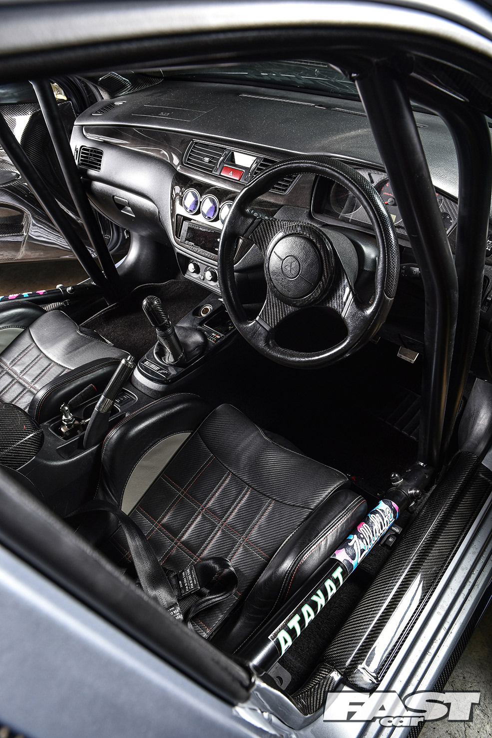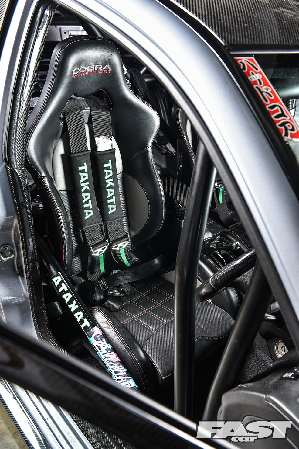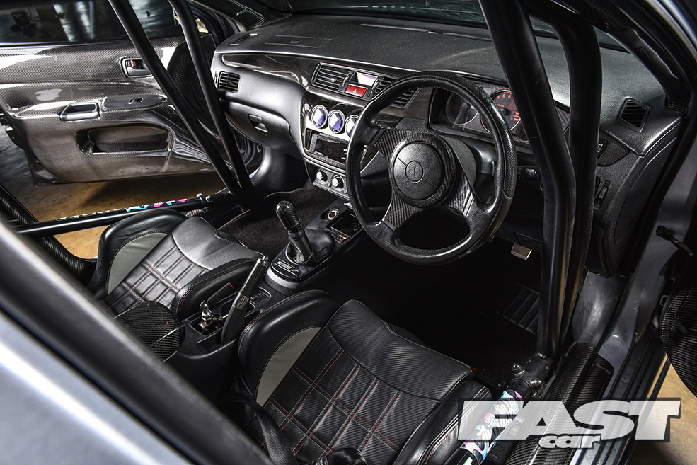 Daibutsu-R dry carbon fibre interior parts with single- coat lacquer: doorcards, A,B,C & D pillar covers, kick plates, parcel shelf; Cobra Misano carbon fibre-backed seats with carbon leather and custom stitching, Takata 4-point harnesses, OMP harness cutter, Rexspeed carbon fibre steering wheel cover, speedo surround and armrest cover, Ralliart pedals, carbon-fibre window switches and gear surround, custom headlining, Blitz turbo timer, A’PEXi AVCR, AMS carbon gearknob, Coltspeed carbon-fibre gauge and stereo pod, Safety Devices rollcage, Audi R8 accessory net
