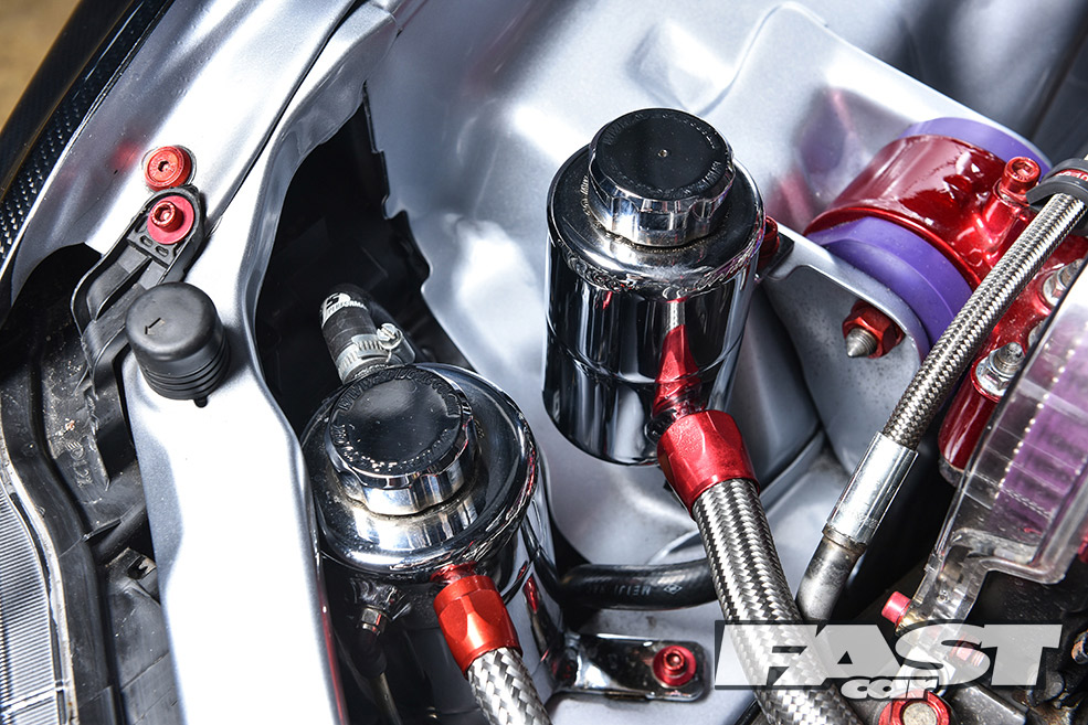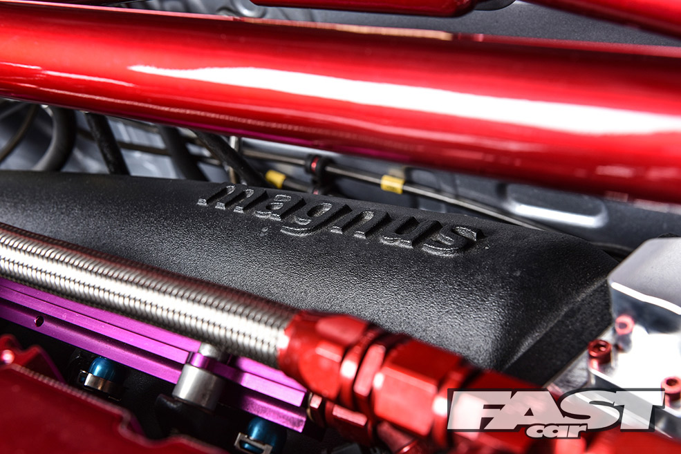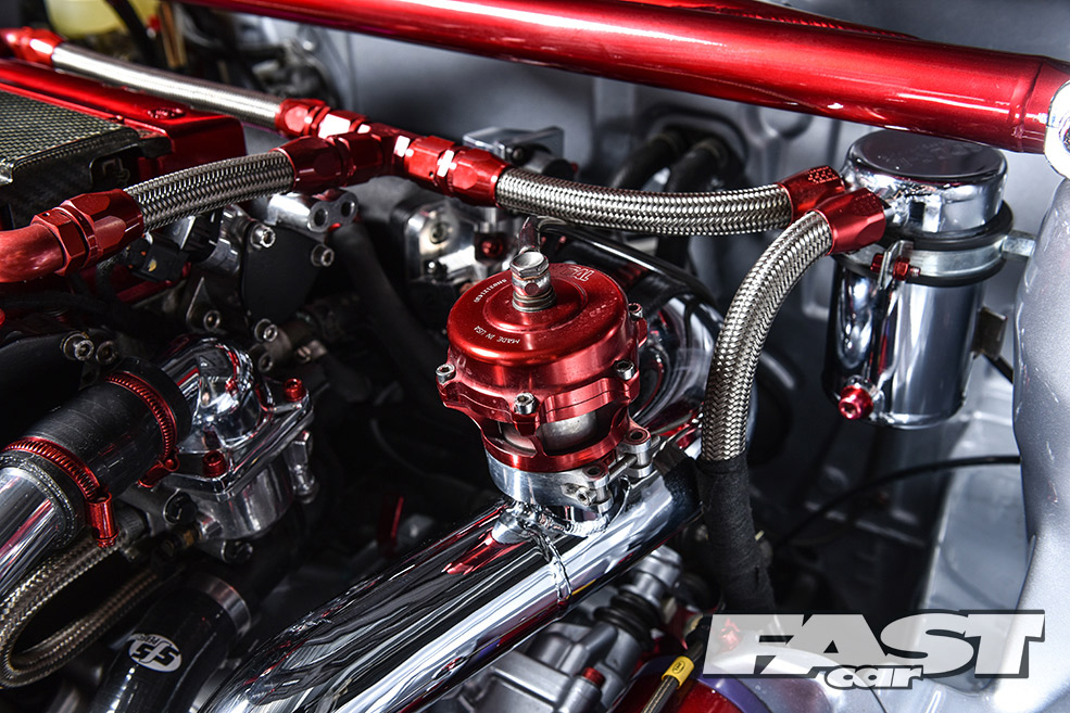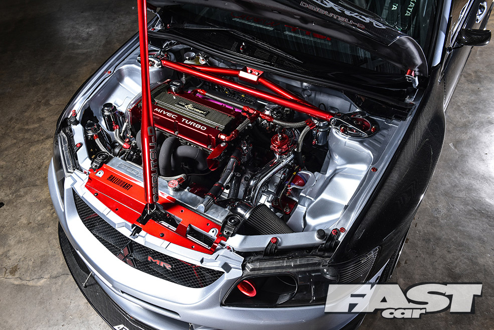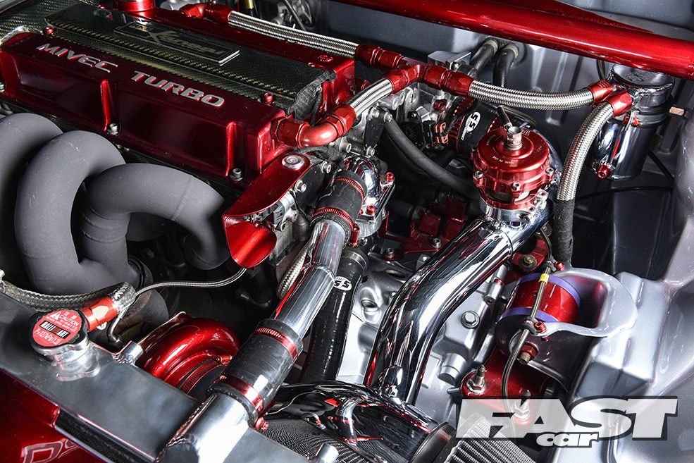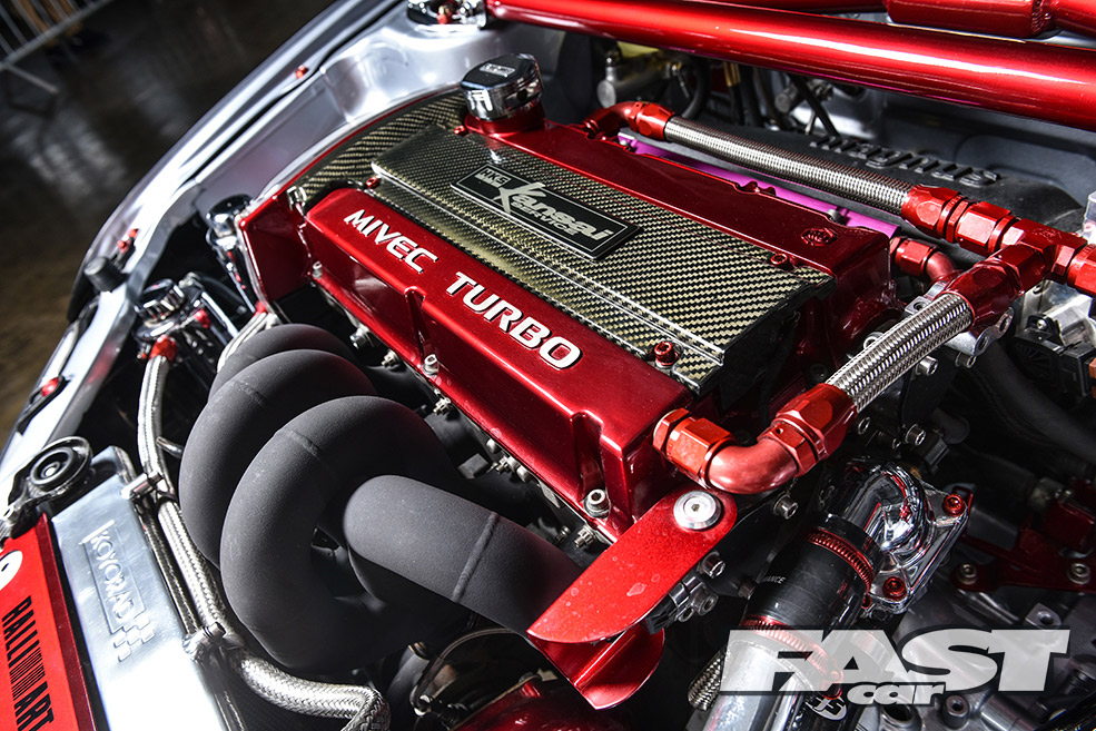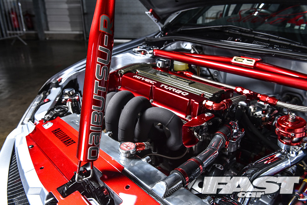Indigo-GT built 2.0-litre 4G63 MIVEC – stroked to 2.2-litres, Precision 6266 turbo with Zircotec black hotside, Zircotec black manifold, elbow and downpipe, Oliver Extreme billet rods, billet crank, CP 85.5mm pistons, Supertech dual valve springs, Ferrea valve guides and collets, Tial F38 wastegate and BOV, Fluidampr harmonic balancer, Race Developments cylinder head, HKS gaskets, ACL Race bearings ARP main studs, A1 head studs, Kelford 272 cams, HKS cam pulley, Indigo-GT lash adjusters, HKS timing belt, ARP manifold studs, 3in downpipe, 4in K&N filter, Magnus black intake, chromed tanks, thermo housing, sensors, intercooler and intake pipework, boot-mounted fuel system with Sytec pump and swirl pot, 3in Blitz Nur exhaust system, Koyo radiator, AMS race intercooler, braided Hel turbo oil and boost lines, HKS Kansai carbon fibre plug cover, Zaklee clear cam cover, Spec-R chrome tanks, battery relocated to boot, carbon-dipped rocker cover, Ralliart cooling plate, rad cap and thermostat, Super Pro engine mount and gearbox bushes, Blox engine mounts, Tomei piston oil cap, LINK ECU with anti-lag, launch control and switchable maps, factory 5-speed RS manual gearbox, RS diff conversion with RS propshaft 702bhp, 590lb.ft